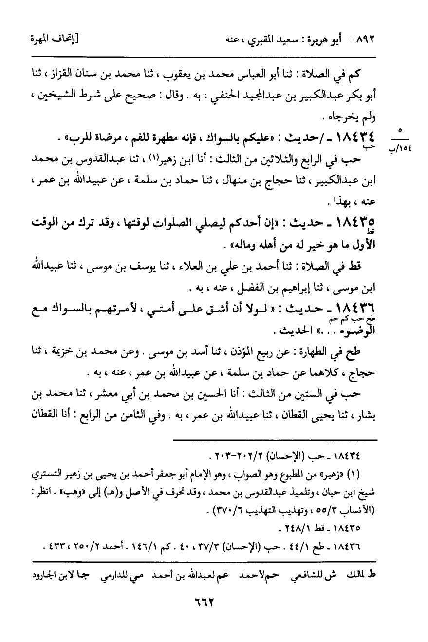 كم في الطهارة: ثنا علي بن حمشاذ، ثنا إسماعيل بن إسحاق، ثنا عارم. وعن محمد بن صالح بن هانئ، ثنا يحيى بن محمد بن يحيى، ثنا عبد الله بن عبد الوهاب، كلاهما عن حماد بن زيد، عن عبد الرحمن السراج، عن سعيد، به.