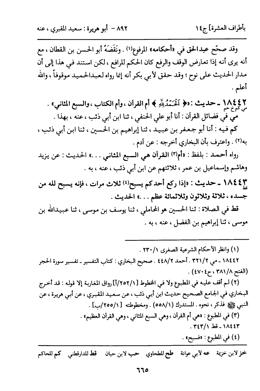 رواه أحمد: بلفظ: "أم القرآن هي السبع المثاني ... " الحديث: عن يزيد وهاشم وإسماعيل بن عمر، ثلاثتهم عن ابن أبي ذئب، عنه، به.