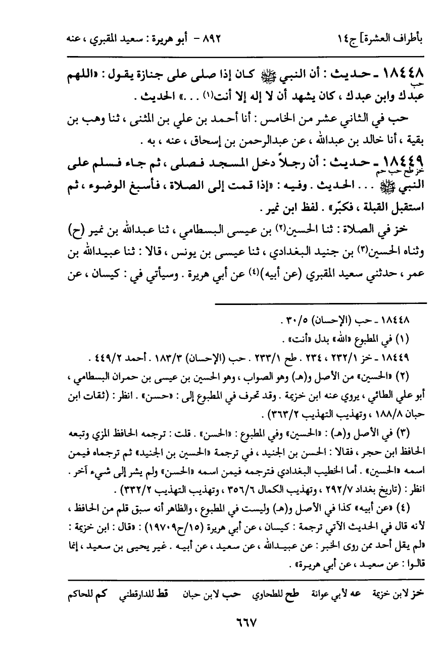 خز في الصلاة: ثنا الحسين بن عيسى البسطامي، ثنا عبد الله بن نمير (ح) وثنا. الحسين بن جنيد البغدادي، ثنا عيسى بن يونس، قالا: ثنا عبيد الله بن عمر، حدثني سعيد المقبري (عن أبيه) عن أبي هريرة. وسيأتي في: كيسان، عن