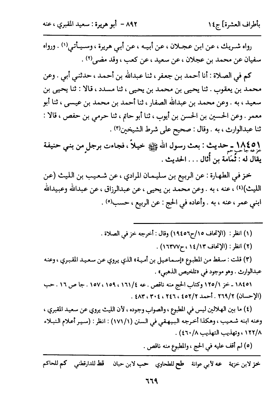 18451 - حديث (خز عه جا حب حم) : بعث رسول الله - صَلَّى اللَّهُ عَلَيْهِ وَسَلَّمَ - خيلاً، فجاءت برجل من بني حنيفة يقال له: ثمَامة بن أُثال ... الحديث.