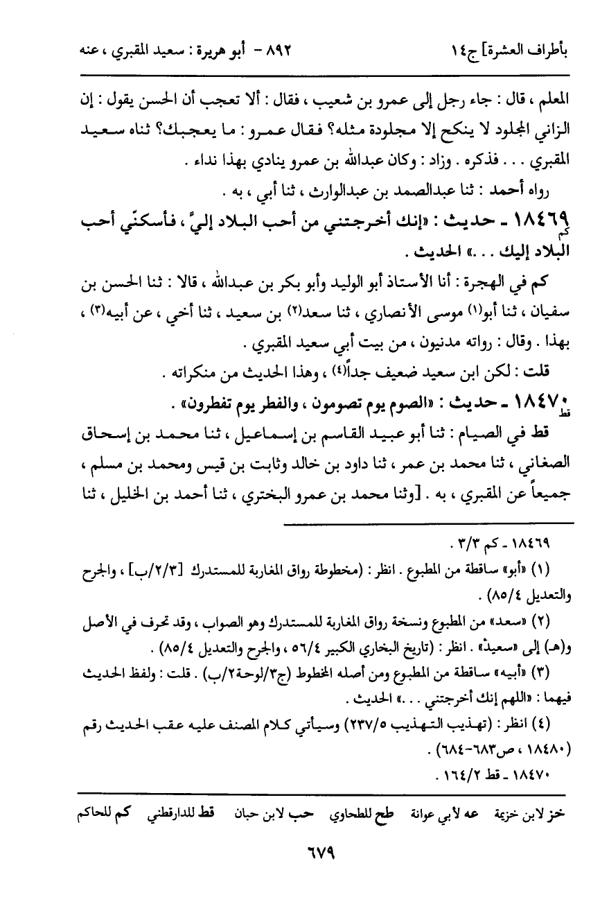 كم في الهجرة: أنا الأستاذ أبو الوليد وأبو بكر بن عبد الله، قالا: ثنا الحسن بن سفيان، ثنا أبو موسى الأنصاري، ثنا سعد بن سعيد، ثنا أخي، عن أبيه، بهذا. وقال: رواته مدنيون، من بيت أبي سعيد المقبري.
