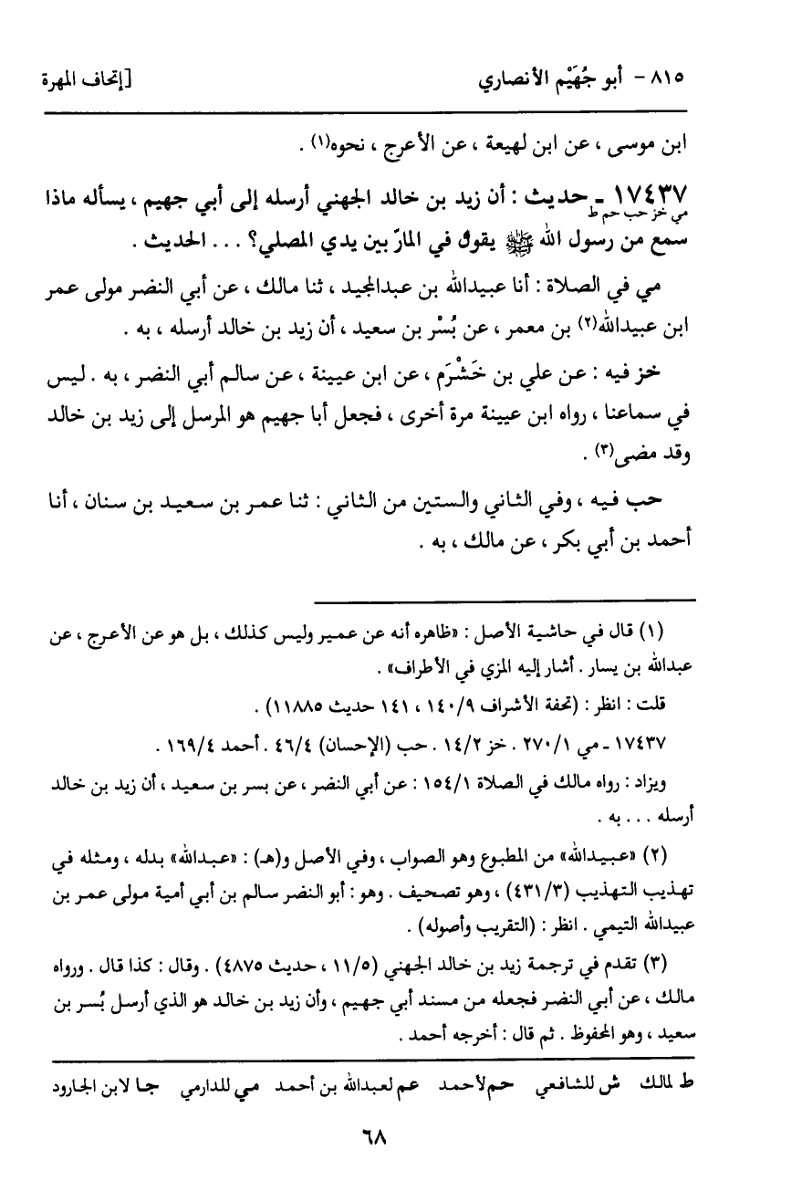 17437 - حديث (مي خز حب حم ط) : أن زيد بن خالد الجهني أرسله إلى أبي جهيم، يسأله ماذا سمع من رسول الله - صَلَّى اللَّهُ عَلَيْهِ وَسَلَّمَ - يقول في المارّ بين يدي المصلي؟ ... الحديث.