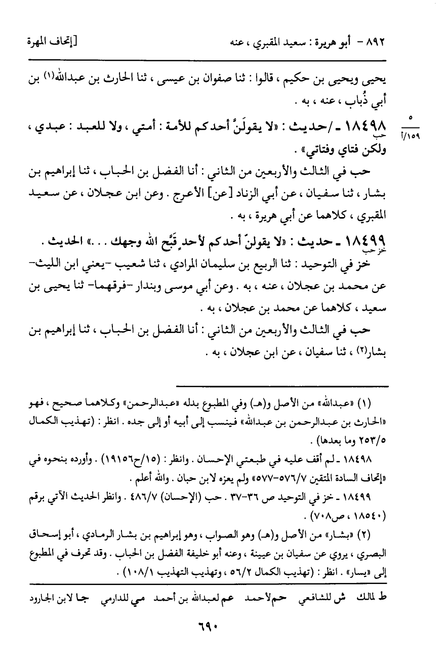 حب في الثالث والأربعين من الثاني: أنا الفضل بن الحباب، ثنا إبراهيم بن بشار، ثنا سفيان، عن أبي الزناد [عن] الأعرج. وعن ابن عجلان، عن سعيد المقبري، كلاهما عن أبي هريرة، به.