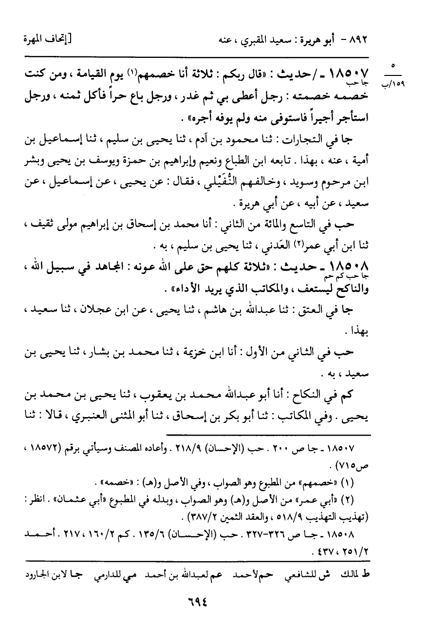 جا في التجارات: ثنا محمود بن آدم، ثنا يحيى بن سليم، ثنا إسماعيل بن أمية، عنه، بهذا. تابعه ابن الطباع ونعيم وإبراهيم بن حمزة ويوسف بن يحيى وبشر ابن مرحوم وسويد، وخالفهم النفَيْلي، فقال: عن يحيى، عن إسماعيل، عن سعيد، عن أبيه، عن أبي هريرة.