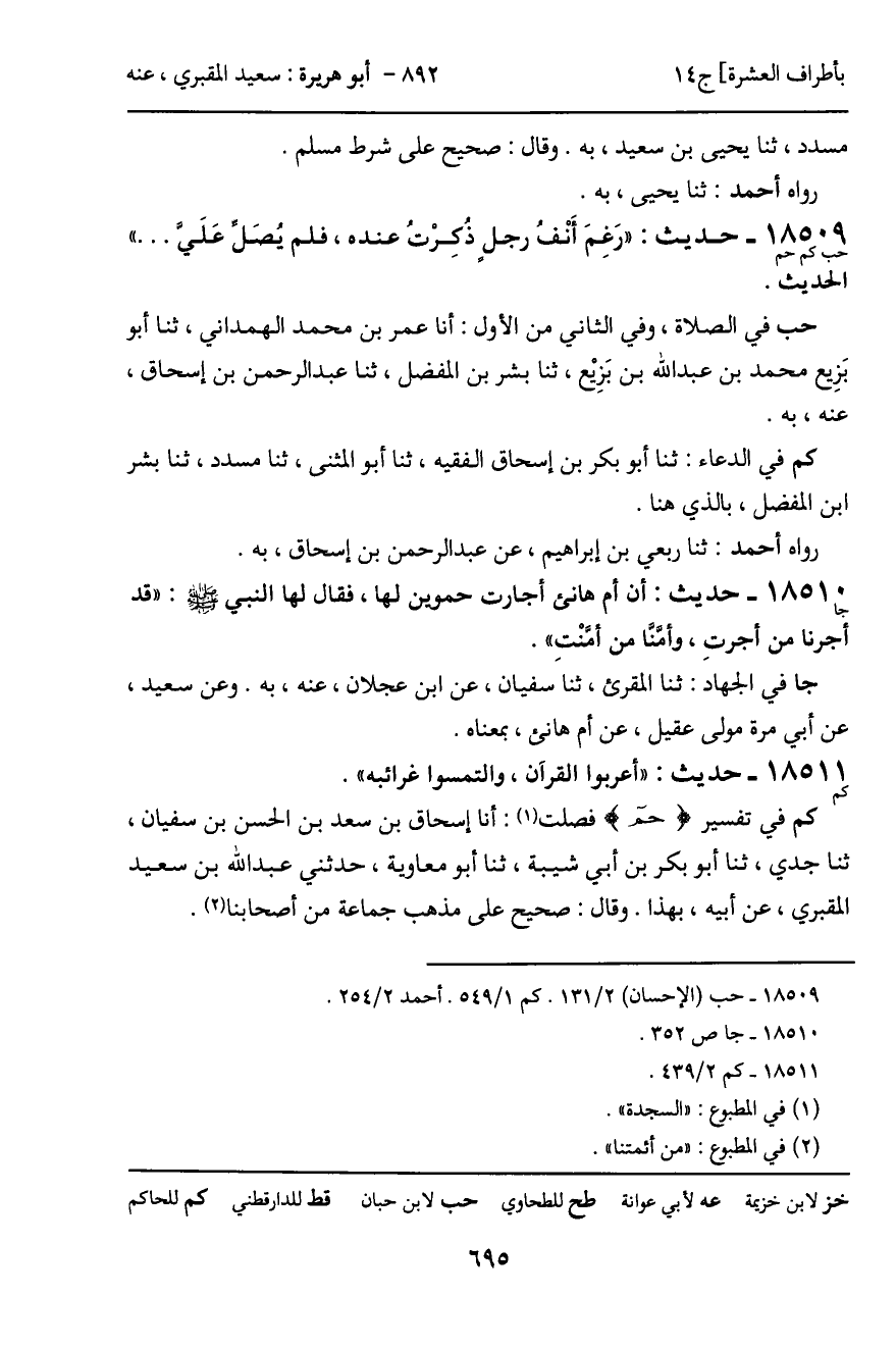 كم في تفسير (حم) فصلت: أنا إسحاق بن سعد بن الحسن بن سفيان، ثنا جدي، ثنا أبو بكر بن أبي شيبة، ثنا أبو معاوية، حدثني عبد الله بن سعيد المقبري، عن أبيه، بهذا. وقال: صحيح على مذهب جماعة من أصحابنا.