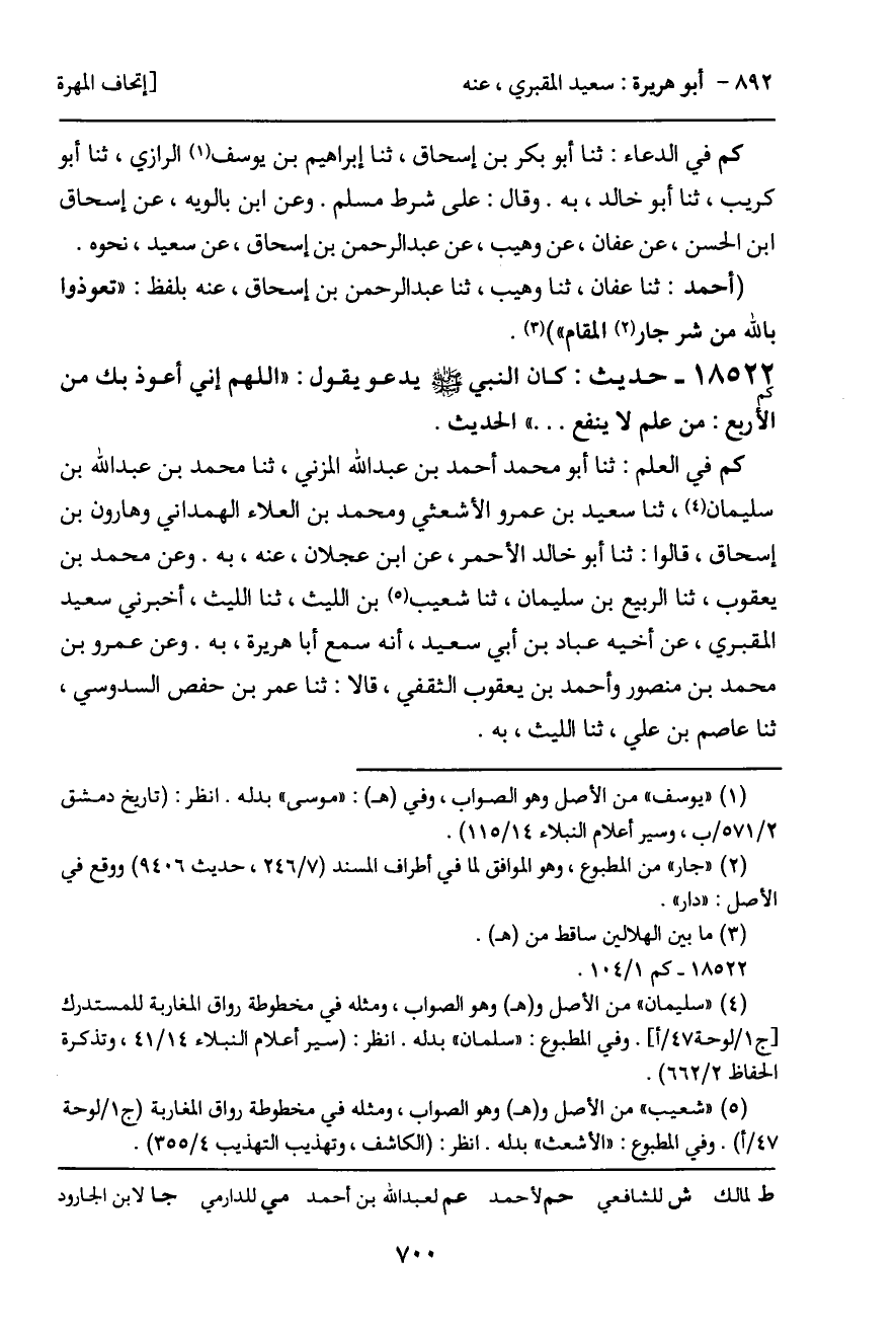 18522 - حديث (كم) : كان النبي - صَلَّى اللَّهُ عَلَيْهِ وَسَلَّمَ - يدعو يقول: "اللهم إني أعوذ بك من الأربع: من علم لا ينفع ... " الحديث.