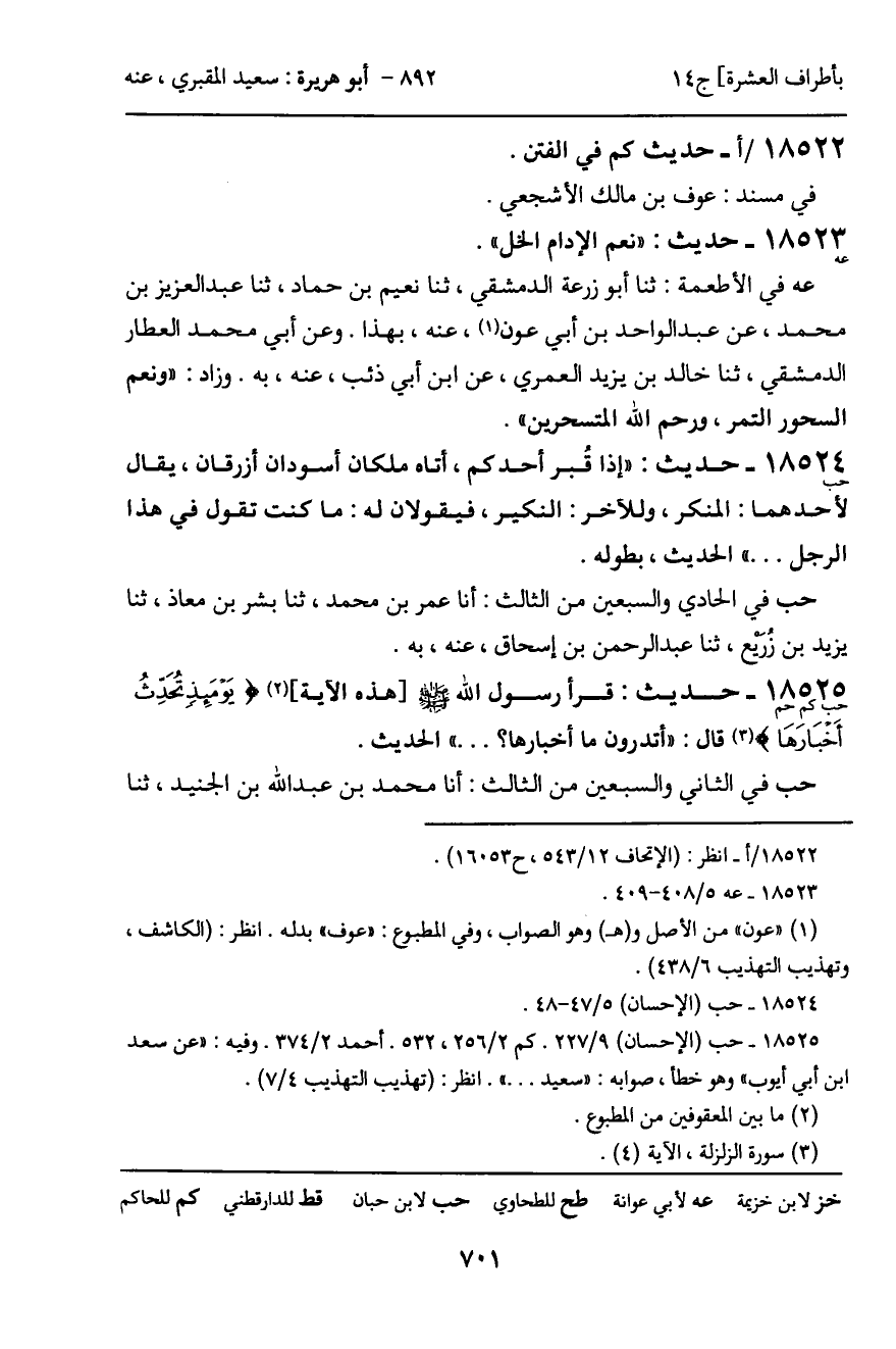 18525 - حديث (حب كم حم) : قرأ رسول الله - صَلَّى اللَّهُ عَلَيْهِ وَسَلَّمَ -[هذه الآية] (يَوْمَئِذٍ تُحَدِّثُ أَخْبَارَهَا) قال: "أتدرون ما أخبارها؟ ... " الحديث.