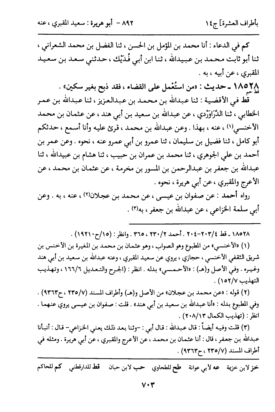 قط في الأقضية: ثنا عبد الله بن محمد بن عبد العزيز، ثنا عبد الله بن عمر الخطابي، ثنا الدرَاوَرْدي، عن عبد الله بن سعيد بن أبي هند، عن عثمان بن محمد الأخنسي، عنه، بهذا. وعن عبد الله بن محمد، قرئ عليه وأنا أسمع، حدثكم أبو كامل، ثنا فضيل بن سليمان، ثنا عمرو بن أبي عمرو عنه، نحوه. وعن عمر بن أحمد بن علي الجوهري، ثنا محمد بن عمران بن حبيب، ثنا هشام بن عبيد الله، ثنا عبد الله بن جعفر بن عبد الرحمن بن المسور بن مخرمة، عن عثمان بن محمد، عن الأعرج والمقبري، عن أبي هريرة، نحوه.