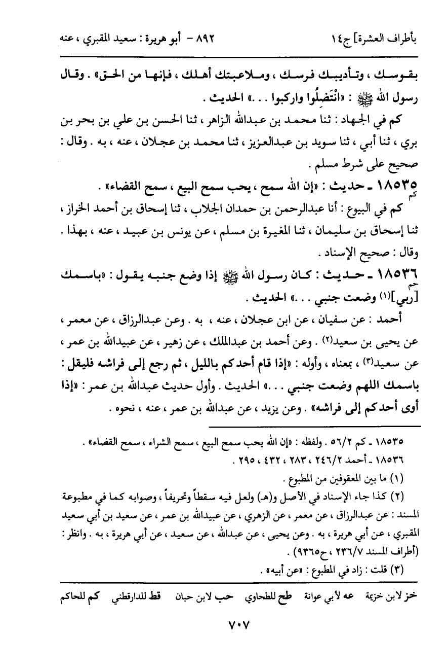 أحمد: عن سفيان، عن ابن عجلان، عنه، به. وعن عبد الرزاق، عن معمر، عن يحيى بن سعيد. وعن أحمد بن عبد الملك، عن زهير، عن عبيد الله بن عمر، عن سعيد، بمعناه، وأوله: "إذا قام أحدكم بالليل، ثم رجع إلى فراشه فليقل: باسمك اللهم وضعت جنبي ... " الحديث. وأول حديث عبد الله بن عمر: "إذا أوى أحدكم إلى فراشه". وعن يزيد، عن عبد الله بن عمر، عنه، نحوه.