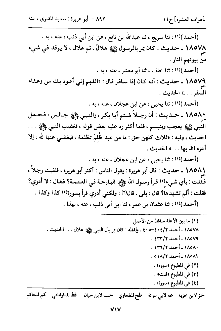 18581 - حديث (حم) : قال أبو هريرة: يقول الناس: أكثر أبو هريرة، فلقيت رجلاً، فقلت: بأي شيء قرأ رسول الله - صَلَّى اللَّهُ عَلَيْهِ وَسَلَّمَ -، البارحة في العتمة؟ فقال: لا أدري؟ فقلت: ألم تشهدها؟ قال: بلى، قال: ولكني أدري قرأ بسورة كذا وكذا.