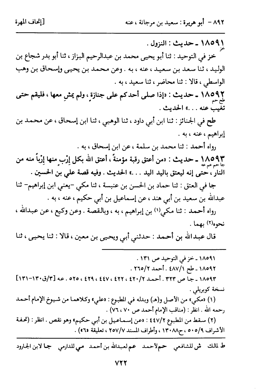 عه في العتق: ثنا محمد بن عبد الله بن عبد الحكم، حدثني أبي وشعيب بن الليث. وثنا العباس الدوري وأحمد بن ملاعب، قالا: ثنا أبو سلمة الخزاعي قال الثلاثة: ثنا الليث، عن يزيد بن الهاد، عن عمر بن علي بن حسين عنه، به. وثنا عباس الدوري، ثنا أبو النضر هاشم بن القاسم، ثنا عاصم بن محمد العمري، ثنا واقد بن محمد. وثنا نصر بن مرزوق المصري، ثنا القاسم بن كثير، حدثني محمد ابن مطرف أبو غسان، عن زيد بن أسلم وعلي بن حسين، كلاهما عن سعيد بن مرجانة. وثنا أبو حاتم الرازي وأحمد بن بشر المرثدي، قالا: ثنا داود بن رُشَيْد، ثنا الوليد بن مسلم، عن محمد بن مطرف، به. وثنا أبو علي الدغولي مطر بن إسماعيل ابن سالم العمي وأبو قلابة، قالا: ثنا مكي بن إبراهيم. وثنا يوسف القاضي، ثنا محمد بن أبي بكر. ثنا يحيى بن سعيد، كلاهما عن عبد الله بن سعيد بن أبي هند، عن إسماعيل بن أبي حكيم مولى لآل الزبير. عن سعيد، به.