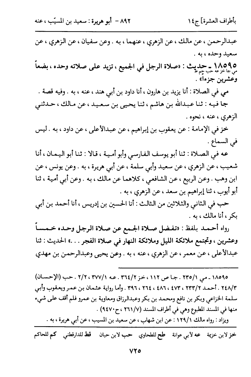 رواه أحمد بلفظ: "تفضل صلاة الجمع عن صلاة الرجل وحده خمساً وعشرين، وتجتمع ملائكة الليل وملائكة النهار في صلاة الفجر ... " الحديث: ثنا عبد الأعلى، عن معمر، عن الزهري، عنه، به. وعن يحيى وعبد الرحمن بن مهدي
