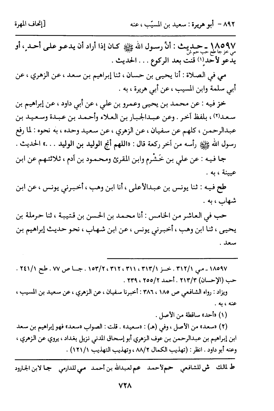 خز فيه: عن محمد بن يحيى وعمرو بن علي، عن أبي داود، عن إبراهيم بن سعد، بلفظ آخر. وعن عبد الجبار بن العلاء وأحمد بن عبدة، سعيد بن عبد الرحمن، كلهم عن سفيان، عن الزهري، عن سعيد وحده، به نحوه: لما رفع رسول الله - صَلَّى اللَّهُ عَلَيْهِ وَسَلَّمَ - رأسه من آخر ركعة قال: "اللهم أنج الوليد بن الوليد ... " الحديث.
