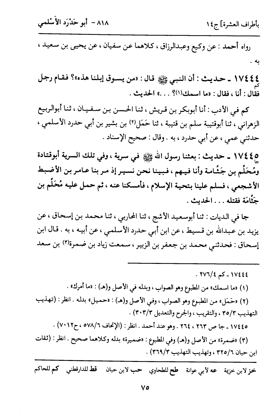جا في الديات: ثنا أبو سعيد الأشج، ثنا المحاربي، ثنا محمد بن إسحاق، عن يزيد بن عبد الله بن قسيط، عن ابن أبي حدرد الأسلمي، عن أبيه، به. قال ابن إسحاق: فحدثني محمد بن جعفر بن الزبير، سمعت زياد بن ضمرة بن سعد