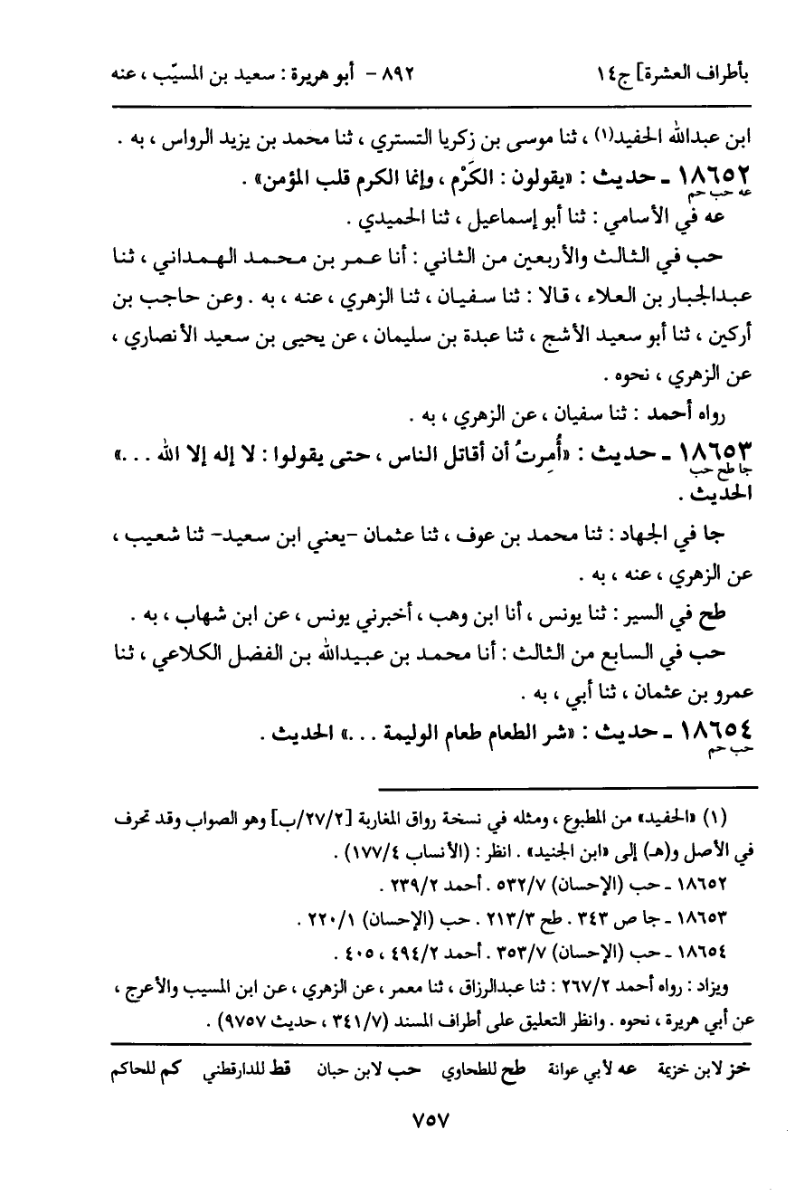 -[758]- حب في الثالث والعشرين من الأول: أنا ابن قتيبة، ثنا ابن أبي السرِي، ثنا عبد الرزاق، أنا معمر، عن الزهري، عن سعيد بن المسيب وعبد الرحمن الأعرج، عن أبي هريرة، به. وعن حاجب بن أركين، ثنا يعقوب بن إبراهيم الدورقي، ثنا محمد ابن عبد الرحمن الطفَاوي، ثنا أيوب، عن الزهري، عن ابن المسيب، وحده، به.