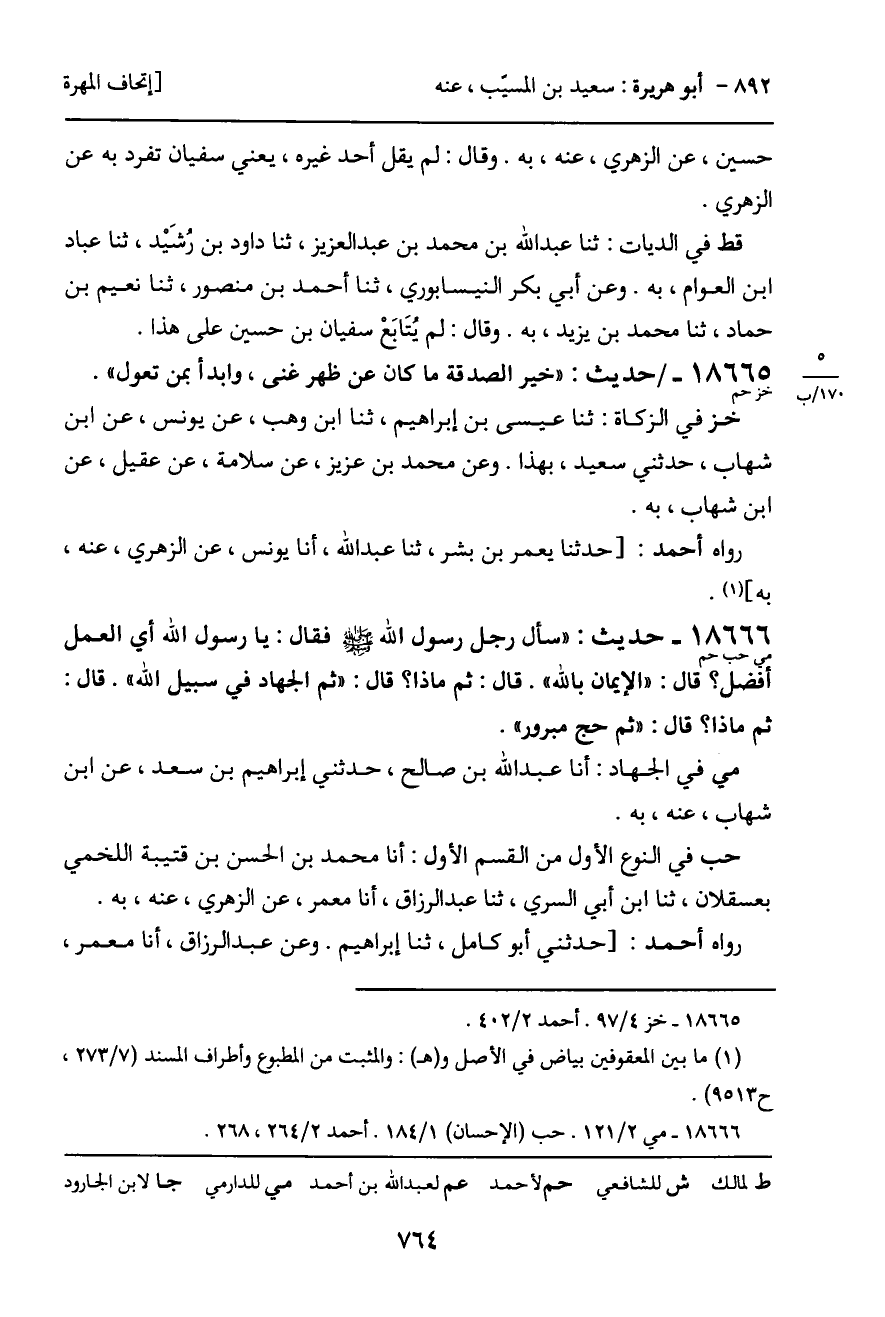18666 - حديث (مي حب حم) : "سأل رجل رسول الله - صَلَّى اللَّهُ عَلَيْهِ وَسَلَّمَ - فقال: يا رسول الله أي العمل أفضل؟ قال: "الإيمان بالله". قال: ثم ماذا؟ قال: "ثم الجهاد في سبيل الله". قال: ثم ماذا؟ قال: "ثم حج مبرور".