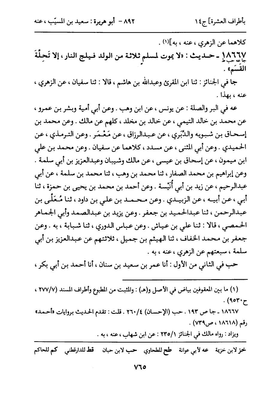 18667 - حديث (جا عه حب ط) : "لا يموت لمسلم ثلاثة من الولد فيلج النار، إلا تَحِلةَ القَسَم".