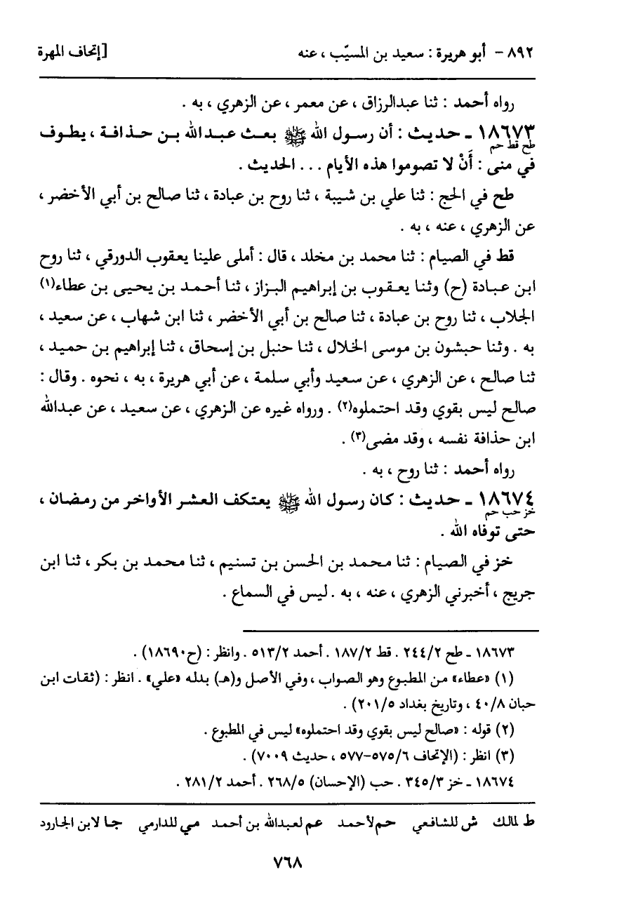 قط في الصيام: ثنا محمد بن مخلد، قال: أملى علينا يعقوب الدورقي، ثنا روح ابن عبادة (ح) وثنا يعقوب بن إبراهيم البزاز، ثنا أحمد بن يحيى بن عطاء الجلاب، ثنا روح بن عبادة، ثنا صالح بن أبي الأخضر، ثنا ابن شهاب، عن سعيد، به. وثنا حبشون بن موسى الخلال، ثنا حنبل بن إسحاق، ثنا إبراهيم بن حميد، ثنا صالح، عن الزهري، عن سعيد وأبي سلمة، عن أبي هريرة، به، نحوه. وقال: صالح ليس بقوي وقد احتملوه. ورواه غيره عن الزهري، عن سعيد، عن عبد الله ابن حذافة نفسه، وقد مضى.