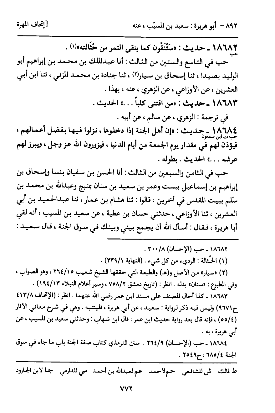 حب في الثامن والسبعين من الثالث: أنا الحسن بن سفيان بنسا وإسحاق بن إبراهيم بن إسماعيل ببست وعمر بن سعيد بن سنان بمنبج وعبد الله بن محمد بن سَلم ببيت المقدس في آخرين، قالوا: ثنا هشام بن عمار، ثنا عبد الحميد بن أبي العشرين، ثنا الأوزاعي، حدثني حسان بن عطية، عن سعيد بن المسيب، أنه لقي أبا هريرة، فقال: أسأل الله أن يجمع بيني وبينك في سوق الجنة، قال سعيد: