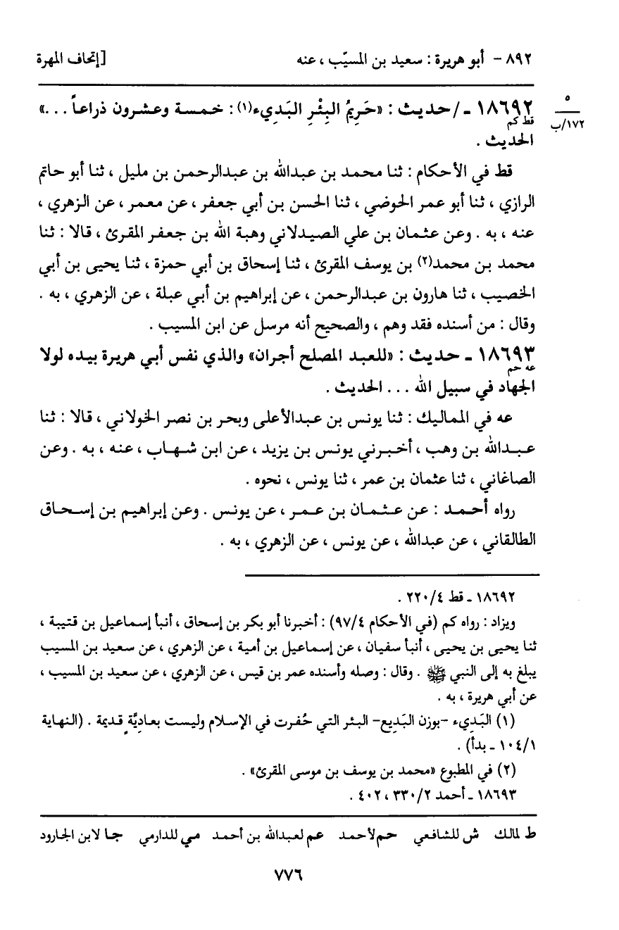 18692 - حديث (قط كم) : "حَريمُ البئْر البَديء: خمسة وعشرون ذراعاً ... " الحديث.