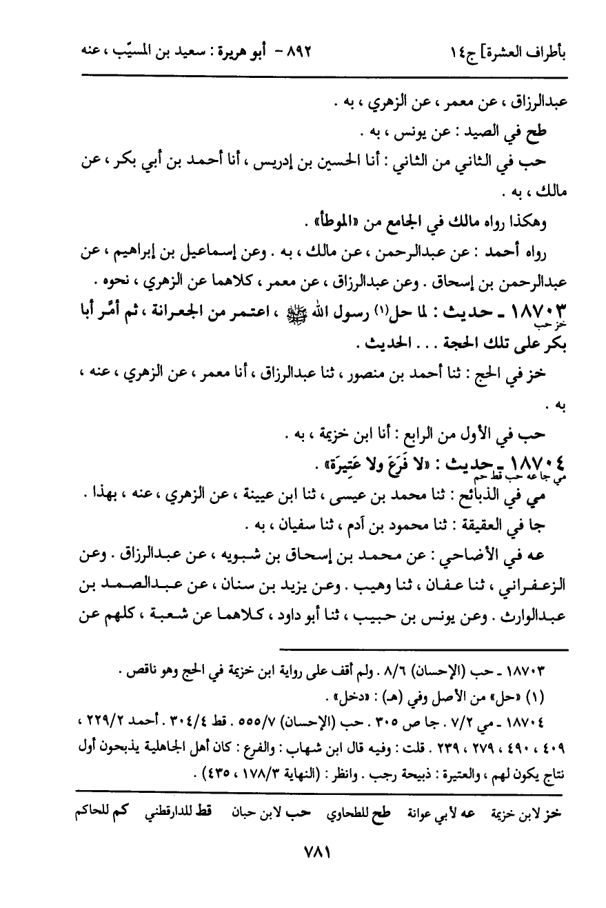 رواه أحمد: بلفظ: "لا عتيرة في الإسلام ولا فرع": ثنا هشيم - قال: إن لم أكن سمعته منه، يعني الزهري - فحدثني سفيان بن حسين، عن الزهري، عنه، به. وعن محمد بن جعفر، عن شعبة، عن معمر - قال محمد: وقد سمعته أنا من معمر - وعن عبد الرزاق، عن معمر. وعن سفيان بن عيينة، كلاهما عن الزهري، نحوه.