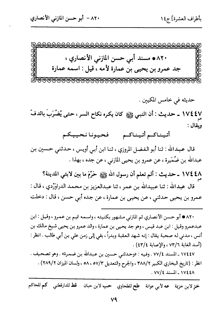820 ـ مسند أبي حسن المازني الأنصاري، جد عمرو بن يحيى بن عمارة لأمه، قيل: اسمه عمارة