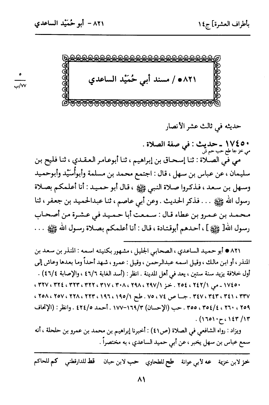 مي في الصلاة: ثنا إسحاق بن إبراهيم، ثنا أبو عامر العقدي، ثنا فليح بن سليمان، عن عباس بن سهل، قال: اجتمع محمد بن مسلمة وأبو أُسَيْد وأبو حميد وسهل بن سعد، فذكروا صلاة النبي - صَلَّى اللَّهُ عَلَيْهِ وَسَلَّمَ -، قال أبو حميد: أنا أعلمكم بصلاة رسول الله - صَلَّى اللَّهُ عَلَيْهِ وَسَلَّمَ - ... فذكر الحديث. وعن أبي عاصم، ثنا عبد الحميد بن جعفر، ثنا محمد بن عمرو بن عطاء قال: سمعت أبا حميد في عشرة من أصحاب رسول الله [- صَلَّى اللَّهُ عَلَيْهِ وَسَلَّمَ -] أحدهم أبو قتادة، قال: أنا أعلمكم بصلاة رسول الله - صَلَّى اللَّهُ عَلَيْهِ وَسَلَّمَ - ...