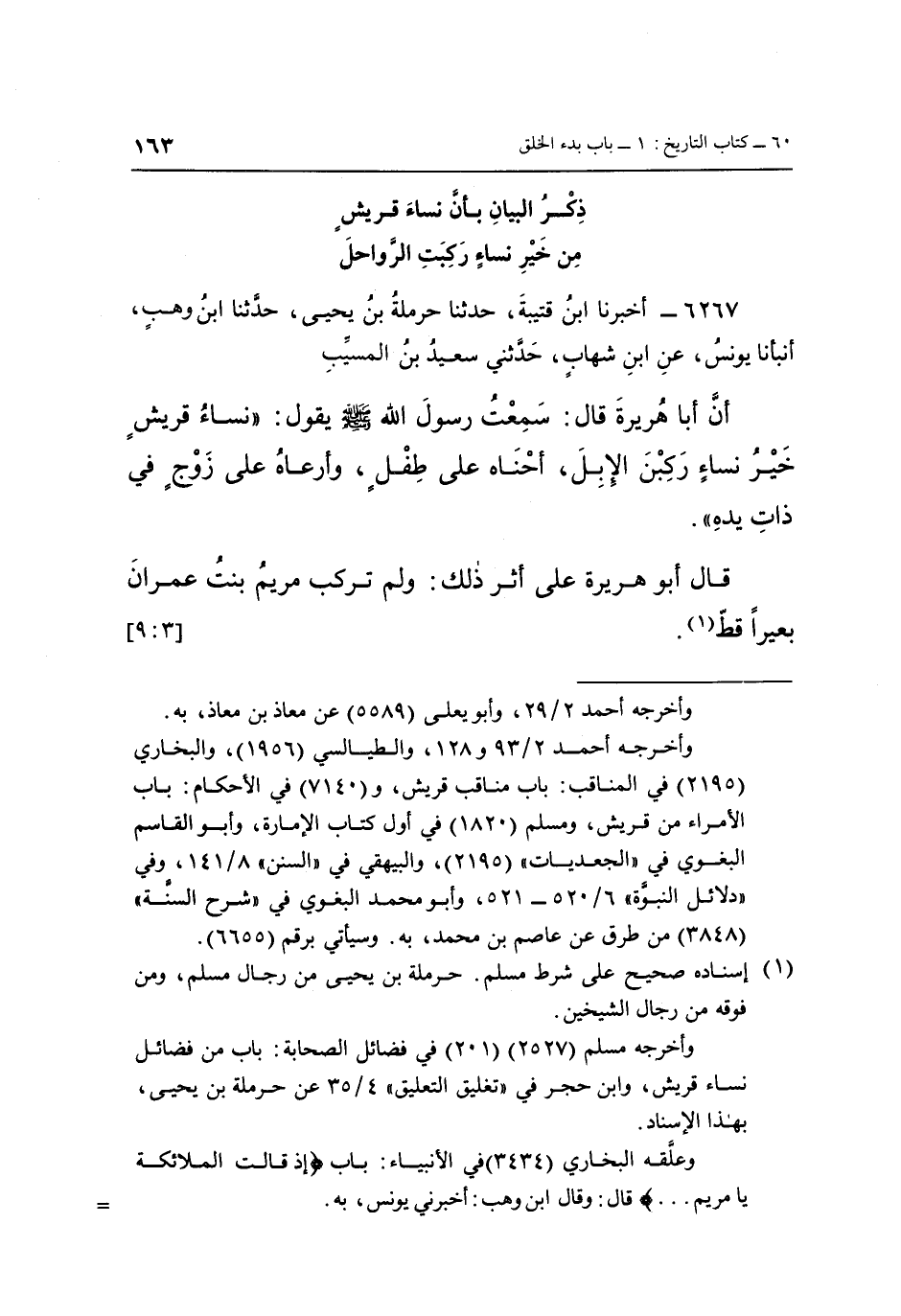 6267 - أَخْبَرَنَا ابْنُ قُتَيْبَةَ، حَدَّثَنَا حَرْمَلَةُ بْنُ يَحْيَى، حَدَّثَنَا ابْنُ وَهْبٍ، أَنْبَأَنَا يُونُسُ، عَنِ ابْنِ شِهَابٍ، حَدَّثَنِي سَعِيدُ بْنُ الْمُسَيَّبِ، أَنَّ أَبَا هُرَيْرَةَ، قَالَ: سَمِعْتُ رَسُولَ اللَّهِ صَلَّى اللَّهُ عَلَيْهِ وَسَلَّمَ يَقُولُ: «نِسَاءُ قُرَيْشٍ خَيْرُ نِسَاءٍ رَكِبْنَ الْإِبِلَ، أَحْنَاهُ عَلَى طِفْلٍ، وَأَرْعَاهُ عَلَى زَوْجٍ فِي ذَاتِ يَدِهِ» قَالَ أَبُو هُرَيْرَةَ عَلَى أَثَرِ ذَلِكَ: «وَلَمْ تَرْكَبْ مَرْيَمُ بِنْتُ عِمْرَانَ بَعِيرًا قَطُّ» (1) . [3: 9]