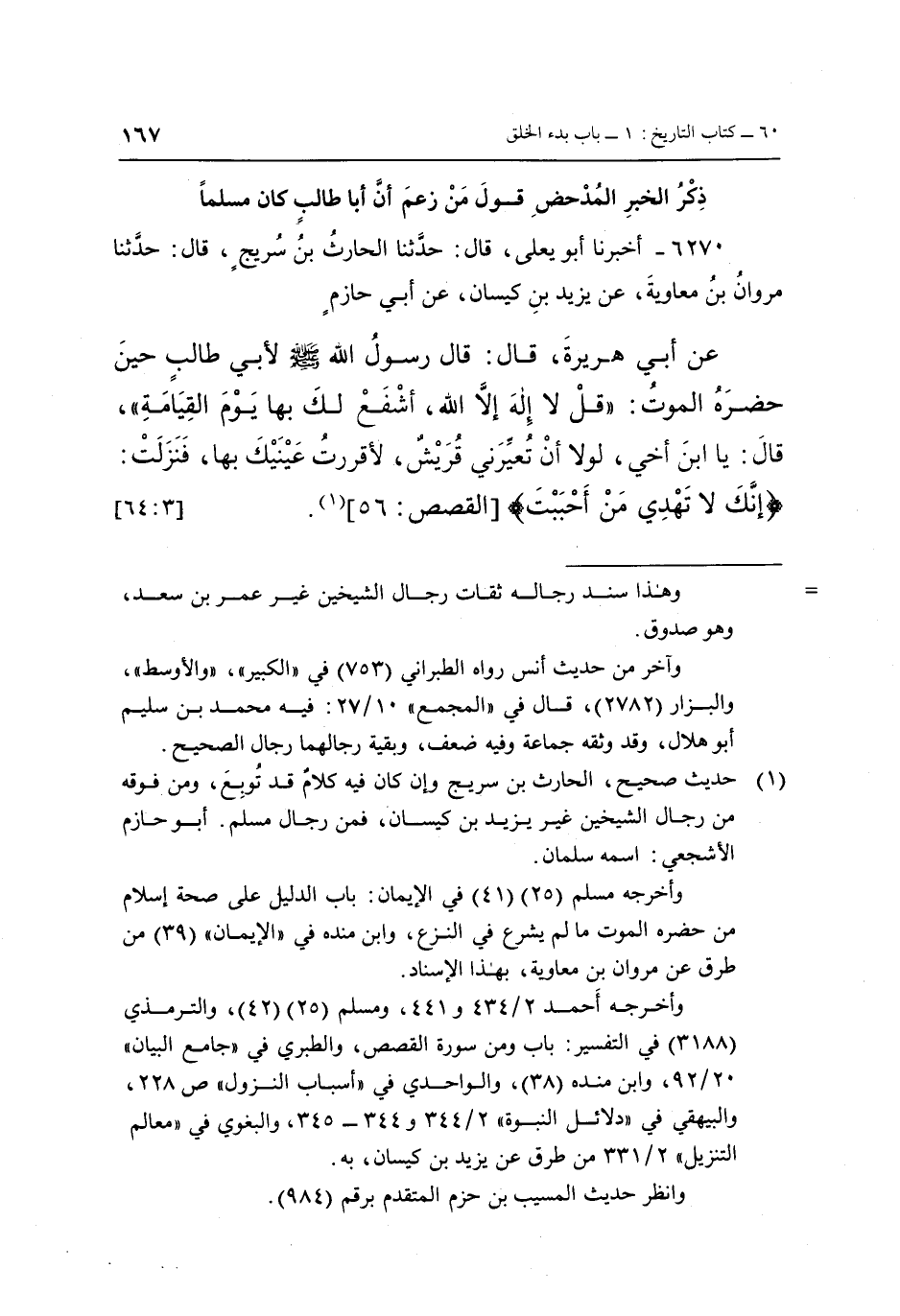 6270 - أَخْبَرَنَا أَبُو يَعْلَى، قَالَ: حَدَّثَنَا الْحَارِثُ بْنُ سُرَيْجٍ، قَالَ: حَدَّثَنَا مَرْوَانُ بْنُ مُعَاوِيَةَ، عَنْ يَزِيدَ بْنَ كَيْسَانَ، عَنْ أَبِي حَازِمٍ، عَنْ أَبِي هُرَيْرَةَ، قَالَ: قَالَ رَسُولُ اللَّهِ صَلَّى اللَّهُ عَلَيْهِ وَسَلَّمَ لِأَبِي طَالِبٍ حِينَ حَضَرَهُ الْمَوْتُ: «قُلْ لَا إِلَهَ إِلَّا اللَّهُ أَشْفَعْ لَكَ بِهَا يَوْمَ الْقِيَامَةِ» ، قَالَ: يَا ابْنَ أَخِي لَوْلَا أَنْ تُعَيِّرَنِيَ قُرَيْشٌ لَأَقْرَرْتُ عَيْنَيْكَ بِهَا، فَنَزَلَتْ: {إِنَّكَ لَا تَهْدِي مَنْ أَحْبَبْتَ} [القصص: 56] (1) . [3: 64]