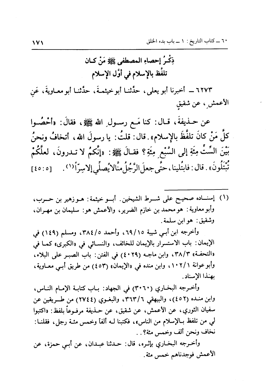 6273 - أَخْبَرَنَا أَبُو يَعْلَى، حَدَّثَنَا أَبُو خَيْثَمَةَ، حَدَّثَنَا أَبُو مُعَاوِيَةَ، عَنِ الْأَعْمَشِ، عَنْ شَقِيقٍ، عَنْ حُذَيْفَةَ، قَالَ: كُنَّا مَعَ رَسُولِ اللَّهِ صَلَّى اللَّهُ عَلَيْهِ وَسَلَّمَ، فَقَالَ: «أَحْصُوا كُلَّ مَنْ كَانَ تَلَفَّظَ بِالْإِسْلَامِ» ، قَالَ: قُلْتُ: يَا رَسُولَ اللَّهِ أَتَخَافُ وَنَحْنُ بَيْنَ السِّتِّ مِائَةٍ إِلَى السَّبْعِ مِائَةٍ؟ فَقَالَ صَلَّى اللَّهُ عَلَيْهِ وَسَلَّمَ: «إِنَّكُمْ لَا تَدْرُونَ لَعَلَّكُمْ تُبْتَلَونَ» ، قَالَ: فَابْتُلِيَنَا حَتَّى جَعَلَ الرَّجُلُ مِنَّا لَا يُصَلِّي إِلَّا سِرًّا (1) . [5: 45]