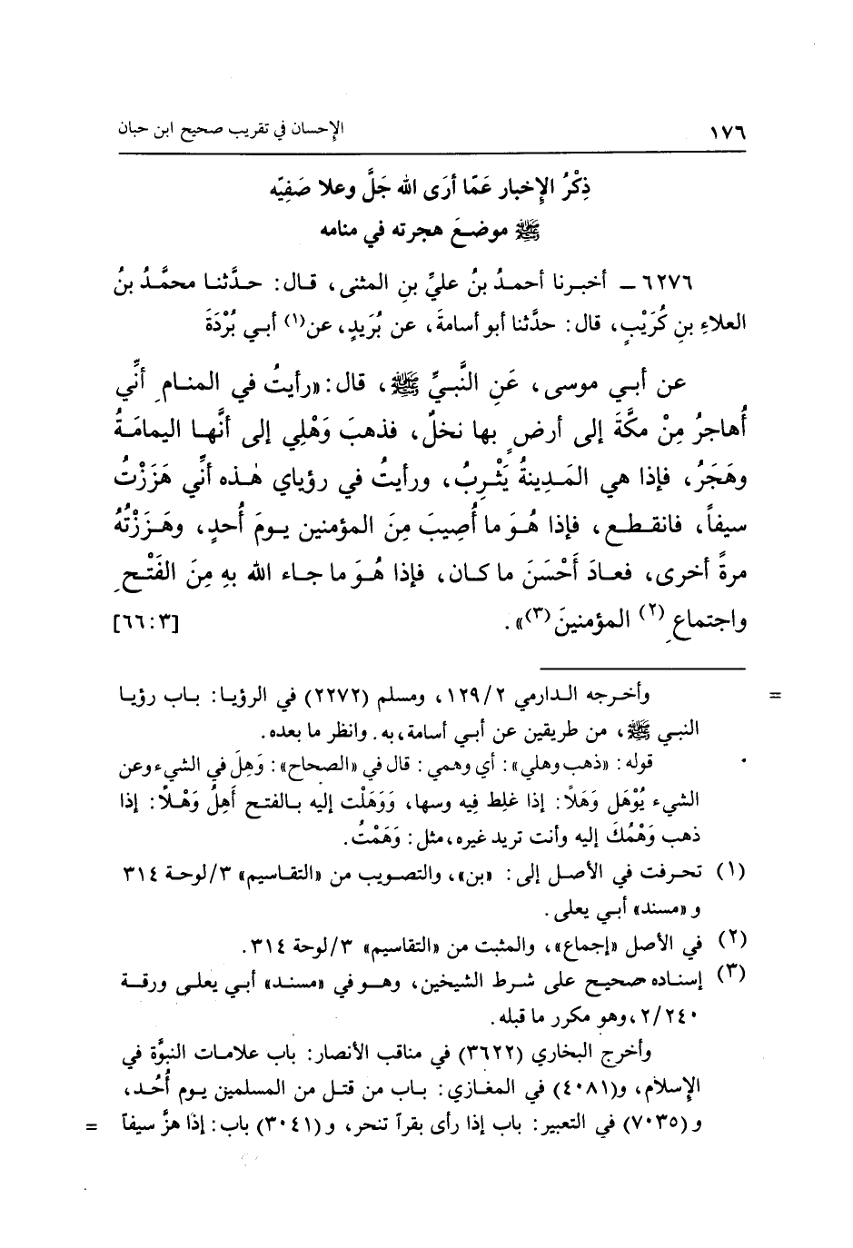 6276 - أَخْبَرَنَا أَحْمَدُ بْنُ عَلِيِّ بْنِ الْمُثَنَّى، قَالَ: حَدَّثَنَا مُحَمَّدُ بْنُ الْعَلَاءِ بْنِ كُرَيْبٍ، قَالَ: حَدَّثَنَا أَبُو أُسَامَةَ، عَنْ بُرَيْدٍ، عَنْ (1) أَبِي بُرْدَةَ، عَنْ أَبِي مُوسَى، عَنِ النَّبِيِّ صَلَّى اللَّهُ عَلَيْهِ وَسَلَّمَ، قَالَ: «رَأَيْتُ فِيَ الْمَنَامِ أَنِّي أُهَاجِرُ مِنْ مَكَّةَ إِلَى أَرْضٍ بِهَا نَخْلٌ، فَذَهَبَ وَهْلِي إِلَى أَنَّهَا الْيَمَامَةُ، وَهَجَرُ، فَإِذَا هِيَ الْمَدِينَةُ يَثْرِبُ، وَرَأَيْتُ فِيَ رُؤْيَايَ هَذِهِ أَنِّي هَزَزْتُ سَيْفًا فَانْقَطَعَ، فَإِذَا هُوَ مَا أُصِيبَ مِنَ الْمُؤْمِنِينَ يَوْمَ أُحُدٍ، وَهَزَزْتُهُ مَرَّةً أُخْرَى فَعَادَ أَحْسَنَ مَا كَانَ، فَإِذَا هُوَ مَا جَاءَ اللَّهُ بِهِ مِنَ الْفَتْحِ وَاجْتِمَاعِ (2) الْمُؤْمِنِينَ (3) » . [3: 66]