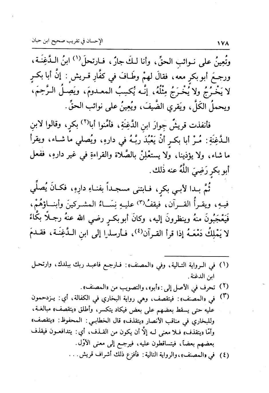 وَتُعِينُ عَلَى نَوَائِبِ الْحَقِّ، وَأَنَا لَكَ جَارٌ، فَارْتَحَلَ (1) ابْنُ الدَّغِنَةِ، وَرَجَعَ أَبُو بَكْرٍ مَعَهُ، فَقَالَ لَهُمْ، وَطَافَ فِي كُفَّارِ قُرَيْشٍ: أَنَّ أَبَا بَكْرٍ، لَا يَخْرُجُ، وَلَا يُخْرَجُ مِثْلُهُ، إِنَّهُ يُكْسِبُ الْمَعْدُومَ، وَيَصِلُ الرَّحِمَ، وَيَحْمِلُ الْكَلَّ، وَيَقْرِي الضَّيْفَ، وَيُعِينُ عَلَى نَوَائِبِ الْحَقِّ، فَأَنْفَذَتْ قُرَيْشٌ جِوَارَ ابْنِ الدَّغِنَةِ، فَأَمَّنُوا أَبَا (2) بَكْرٍ، وَقَالُوا لِابْنِ الدَّغِنَةِ: مُرْ أَبَا بَكْرٍ أَنْ يَعْبُدَ رَبَّهُ فِي دَارِهِ وَيُصَلِّيَ مَا شَاءَ، وَيَقْرَأَ مَا شَاءَ، وَلَا يُؤْذِينَا، وَلَا يَسْتَعْلِنْ بِالصَّلَاةِ وَالْقِرَاءَةِ فِي غَيْرِ دَارِهِ، فَفَعَلَ أَبُو بَكْرٍ رَضِيَ اللَّهُ عَنْهُ ذَلِكَ، ثُمَّ بَدَا لِأَبِي بَكْرٍ فَابْتَنَى مَسْجِدًا بِفِنَاءِ دَارِهِ، فَكَانَ يُصَلِّي فِيهِ، وَيَقْرَأُ الْقُرْآنَ، فَيَقِفُ (3) عَلَيْهِ نِسَاءُ الْمُشْرِكِينَ وَأَبْنَاؤُهُمْ، فَيَعْجَبُونَ مِنْهُ، وَيَنْظُرُونَ إِلَيْهِ، وَكَانَ أَبُو بَكْرٍ رَضِيَ اللَّهُ عَنْهُ رَجُلًا بَكَّاءً لَا يَمْلِكُ دَمْعَهُ إِذَا قَرَأَ الْقُرْآنَ (4) ، فَأَرْسَلُوا إِلَى ابْنِ الدَّغِنَةِ، فَقَدِمَ