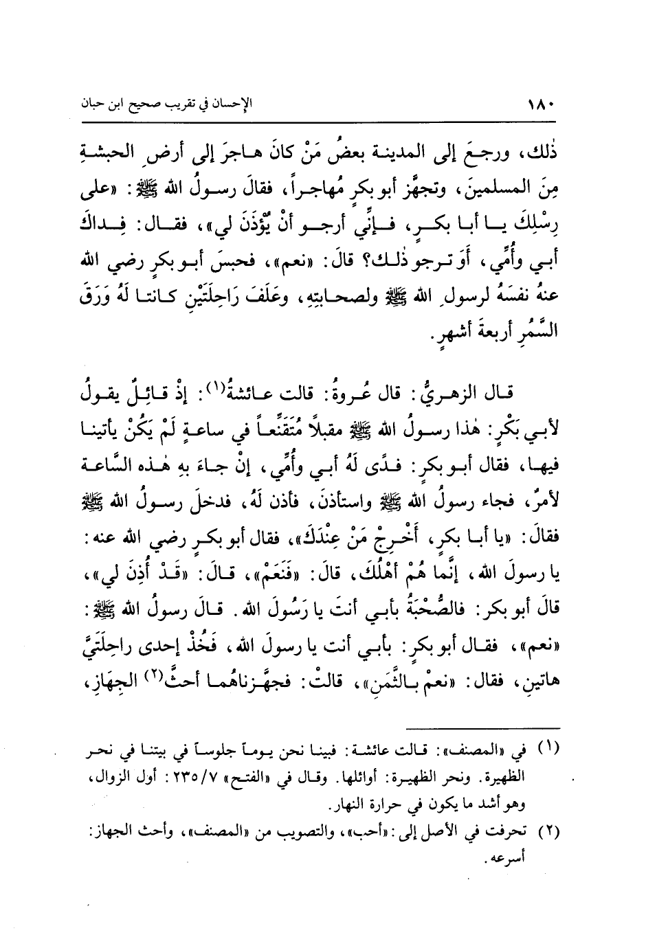 قَالَ الزُّهْرِيُّ: قَالَ عُرْوَةُ: قَالَتْ عَائِشَةُ (1) : إِذْ قَائِلٌ يَقُولُ لِأَبِي بَكْرٍ: هَذَا رَسُولُ اللَّهِ صَلَّى اللَّهُ عَلَيْهِ وَسَلَّمَ، مُقْبِلًا مُتَقَنِّعًا فِي سَاعَةٍ لَمْ يَكُنْ يَأْتِينَا فِيهَا، فَقَالَ أَبُو بَكْرٍ: فِدًى لَهُ أَبِي وَأُمِّي، إِنْ جَاءَ بِهِ هَذِهِ السَّاعَةُ لَأَمْرٌ، فَجَاءَ رَسُولُ اللَّهِ صَلَّى اللَّهُ عَلَيْهِ وَسَلَّمَ وَاسْتَأْذَنَ فَأُذِنَ لَهُ، فَدَخَلَ رَسُولُ اللَّهِ صَلَّى اللَّهُ عَلَيْهِ وَسَلَّمَ، فَقَالَ: «يَا أَبَا بَكْرٍ أَخْرِجْ مَنْ عِنْدَكَ» ، فَقَالَ أَبُو بَكْرٍ رَضِيَ اللَّهُ عَنْهُ: يَا رَسُولَ اللَّهِ إِنَّمَا هُمْ أَهْلُكَ، قَالَ: «فَنَعَمْ» ، قَالَ: «قَدْ أُذِنَ لِي» ، قَالَ أَبُو بَكْرٍ: فَالصُّحْبَةُ بِأَبِي أَنْتَ يَا رَسُولَ اللَّهِ، قَالَ رَسُولُ اللَّهِ صَلَّى اللَّهُ عَلَيْهِ وَسَلَّمَ: «نَعَمْ» ، فَقَالَ أَبُو بَكْرٍ: بِأَبِي أَنْتَ يَا رَسُولَ اللَّهِ، فَخُذْ إِحْدَى رَاحِلَتِي هَاتَيْنِ، فَقَالَ: «نَعَمْ، بِالثَّمَنِ» ، قَالَتْ: فَجَهَّزْنَاهُمَا أَحَثَّ (2) الْجِهَازِ،