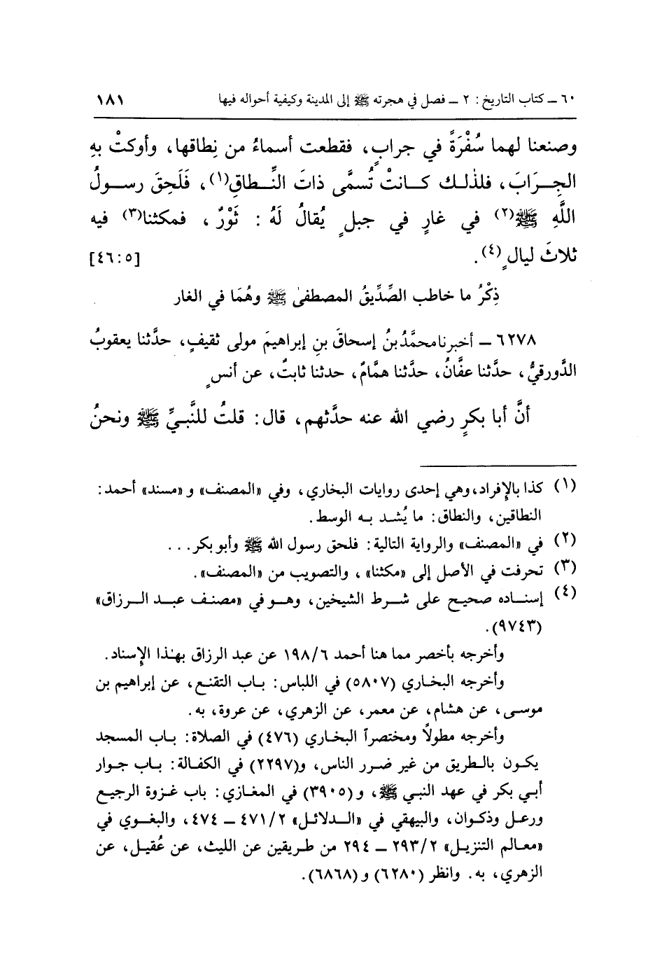 وَصَنَعْنَا لَهُمَا سُفْرَةً فِي جِرَابٍ، فَقَطَعَتْ أَسْمَاءُ مِنْ نِطَاقِهَا، وَأَوْكَتْ بِهِ الْجِرَابَ، فَلِذَلِكَ كَانَتْ تُسَمَّى: ذَاتَ النِّطَاقِ (1) ، فَلَحِقَ رَسُولُ اللَّهِ صَلَّى اللَّهُ عَلَيْهِ وَسَلَّمَ (2) فِي غَارٍ فِي جَبَلٍ يُقَالُ لَهُ: ثَوْرٌ، فَمَكَثْنَا (3) فِيهِ ثَلَاثَ لَيَالٍ (4) . [5: 46]