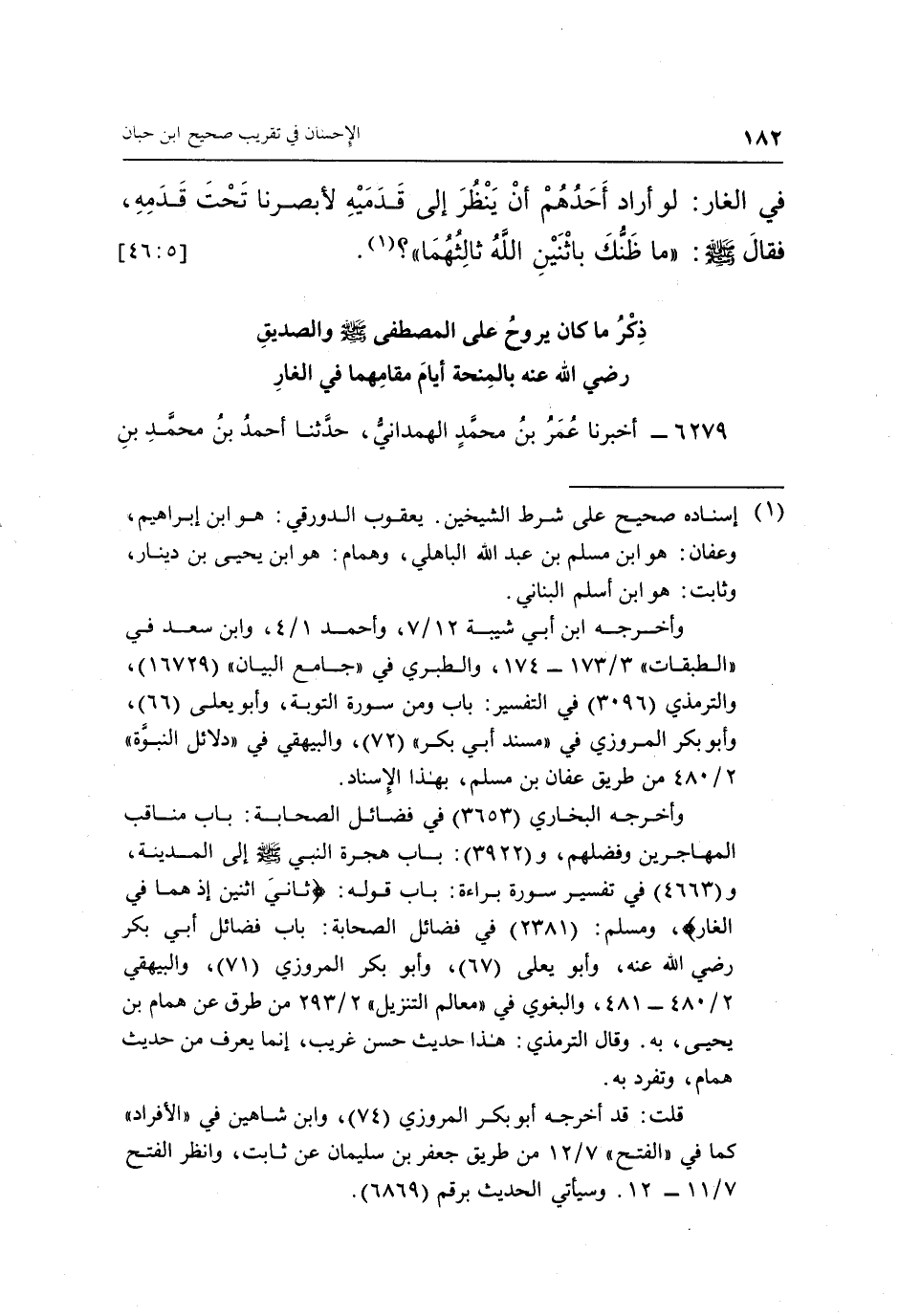 وأخرجه البخاري (3653) في فضائل الصحابة: باب مناقب المهاجرين وفضلهم، و (3922) : باب هجرة النبي - صلى الله عليه وسلم - إلى المدينة، و (4663) في تفسير سورة براءة: باب قوله: {ثانيَ اثنين إذ هما في الغار} ، ومسلم: (2381) في فضائل الصحابة: باب فضائل أبي بكر رضي الله عنه، وأبو يعلى (67) ، وأبو بكر المروزي (71) ، والبيهقي 2/480-481، والبغوي في "معالم التنزيل" 2/293 من طرق عن همام بن يحيى، به. وقال الترمذي: هذا حديث حسن غريب، إنما يعرف من حديث همام، وتفرد به.