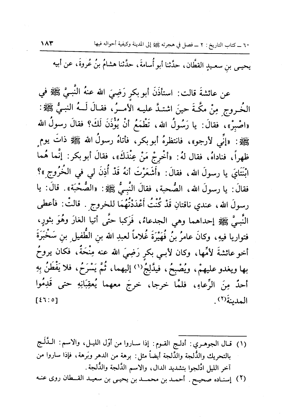 يَحْيَى بْنِ سَعِيدٍ الْقَطَّانُ، حَدَّثَنَا أَبُو أُسَامَةَ، حَدَّثَنَا هِشَامُ بْنُ عُرْوَةَ، عَنْ أَبِيهِ، عَنْ عَائِشَةَ، قَالَتِ: اسْتَأْذَنَ أَبُو بَكْرٍ رَضِيَ اللَّهُ عَنْهُ النَّبِيَّ صَلَّى اللَّهُ عَلَيْهِ وَسَلَّمَ فِي الْخُرُوجِ مِنْ مَكَّةَ حِينَ اشْتَدَّ عَلَيْهِ الْأَمْرُ، فَقَالَ لَهُ النَّبِيُّ صَلَّى اللَّهُ عَلَيْهِ وَسَلَّمَ: «اصْبِرْ» ، فَقَالُ: يَا رَسُولَ اللَّهِ تَطْمَعُ أَنْ يُؤْذَنَ لَكَ؟ فَقَالَ رَسُولُ اللَّهِ صَلَّى اللَّهُ عَلَيْهِ وَسَلَّمَ: «إِنِّي لَأَرْجُو» ، فَانْتَظَرَهُ أَبُو بَكْرٍ، فَأَتَاهُ رَسُولُ اللَّهِ صَلَّى اللَّهُ عَلَيْهِ وَسَلَّمَ ذَاتَ يَوْمٍ ظُهْرًا، فَنَادَاهُ، فَقَالَ لَهُ: «اخْرُجْ مَنْ عِنْدَكِ» ، فَقَالَ أَبُو بَكْرٍ: إِنَّمَا هُمَا ابْنَتَايَ يَا رَسُولَ اللَّهِ.