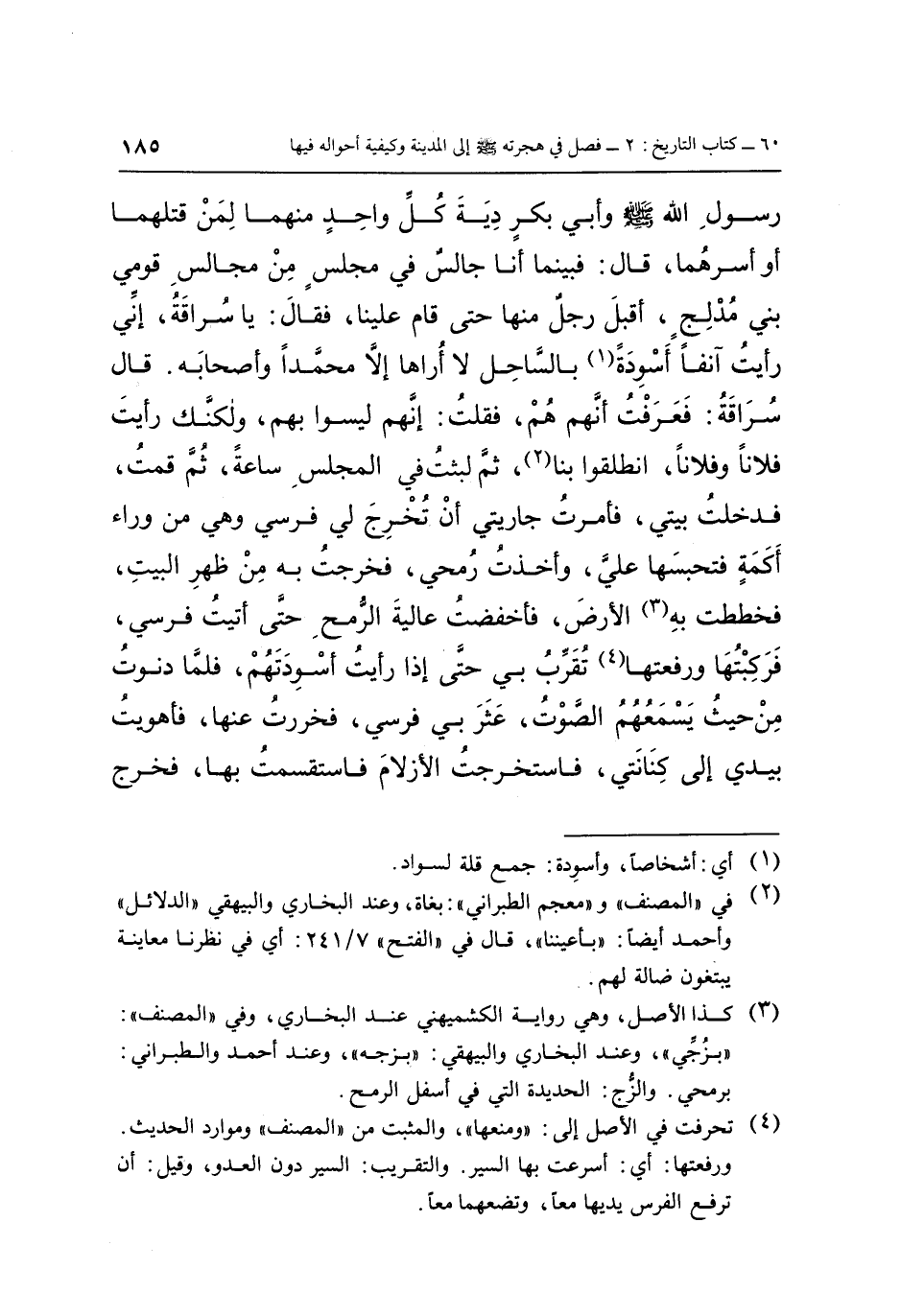 رَسُولِ اللَّهِ صَلَّى اللَّهُ عَلَيْهِ وَسَلَّمَ، وَأَبِي بَكْرٍ دِيَةَ كُلِّ وَاحِدٍ مِنْهُمَا لِمَنْ قَتَلَهُمَا أَوْ أَسَرَهُمَا، قَالَ: فَبَيْنَمَا أَنَا جَالِسٌ فِي مَجْلِسٍ مِنْ مَجَالِسِ قَوْمِي بَنِي مُدْلِجٍ أَقْبَلَ رَجُلٌ مِنْهَا حَتَّى قَامَ عَلَيْنَا، فَقَالَ: يَا سُرَاقَةُ إِنِّي رَأَيْتُ آنِفًا أَسْوِدَةً (1) بِالسَّاحِلِ لَا أُرَاهَا إِلَّا مُحَمَّدًا وَأَصْحَابَهُ، قَالَ سُرَاقَةُ: فَعَرَفْتُ أَنَّهُمْ هُمْ، فَقُلْتُ: إِنَّهُمْ لَيْسُوا بِهِمْ، وَلَكِنَّكَ رَأَيْتَ فُلَانًا وَفُلَانًا، انْطَلِقُوا بِنَا (2) ، ثُمَّ لَبِثْتُ فِي الْمَجْلِسِ سَاعَةً، ثُمَّ قُمْتُ فَدَخَلْتُ بَيْتِي فَأَمَرْتُ جَارِيَتِي أَنْ تُخْرِجَ لِي فَرَسِي وَهِيَ مِنْ وَرَاءِ أَكَمَةٍ فَتَحْبِسَهَا عَلَيَّ، وَأَخَذْتُ رُمْحِي، فَخَرَجْتُ بِهِ مِنْ ظَهْرِ الْبَيْتِ، فَخَطَطْتُ بِهِ (3) الْأَرْضَ فَأَخْفَضْتُ عَالِيَةَ الرُّمْحِ حَتَّى أَتَيْتُ فَرَسِي فَرَكِبْتُهَا، وَرَفَعْتُهَا (4) تُقَرِّبُ بِي حَتَّى إِذَا رَأَيْتُ أَسْوِدَتَهُمْ، فَلَمَّا دَنَوْتُ مِنْ حَيْثُ يَسْمِعُهُمُ الصَّوْتُ عَثَرَ بِي فَرَسِي، فَخَرَرْتُ عَنْهَا، فَأَهْوَيْتُ بِيَدِي إِلَى كِنَانَتِي، فَاسْتَخْرَجْتُ الْأَزْلَامَ، فَاسْتَقْسَمْتُ بِهَا فَخَرَجَ