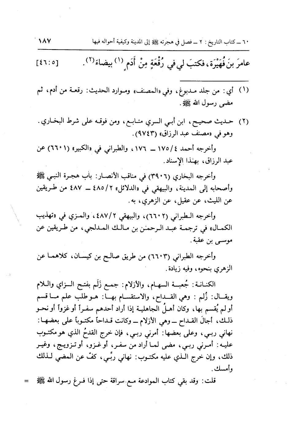 عَامِرَ بْنَ فُهَيْرَةَ، فَكَتَبَ لِي فِي رُقْعَةٍ مِنْ أَدَمٍ (1) بَيْضَاءَ (2) . [5: 46]