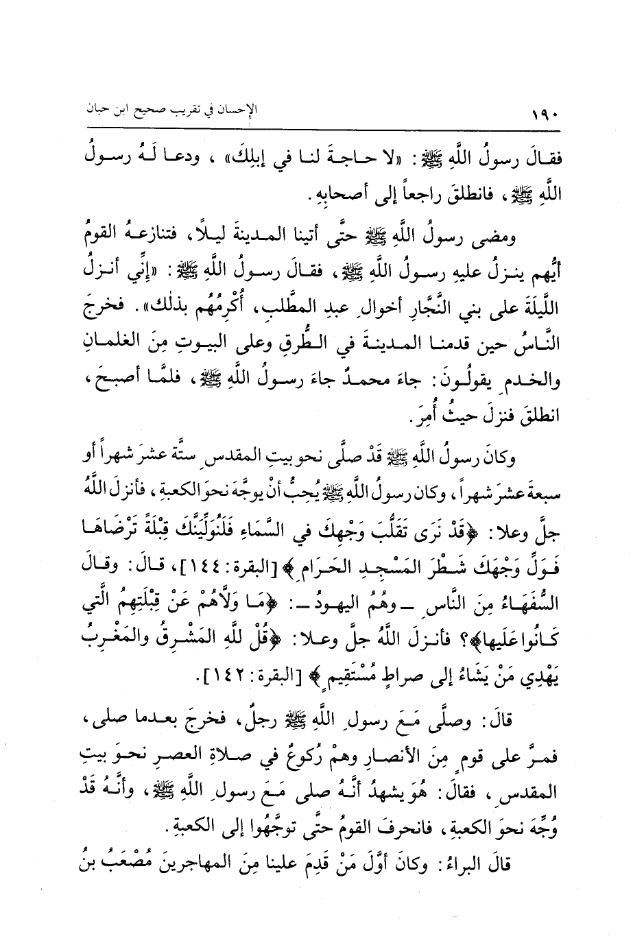 فَقَالَ رَسُولُ اللَّهِ صَلَّى اللَّهُ عَلَيْهِ وَسَلَّمَ: «لَا حَاجَةَ لَنَا فِي إِبِلِكَ» ، وَدَعَا لَهُ رَسُولُ اللَّهِ صَلَّى اللَّهُ عَلَيْهِ وَسَلَّمَ، فَانْطَلَقَ رَاجِعًا إِلَى أَصْحَابِهِ، وَمَضَى رَسُولُ اللَّهِ صَلَّى اللَّهُ عَلَيْهِ وَسَلَّمَ، حَتَّى أَتَيْنَا الْمَدِينَةَ لَيْلًا، فَتَنَازَعَهُ الْقَوْمُ، أَيُّهُمْ يَنْزِلُ عَلَيْهِ رَسُولُ اللَّهِ صَلَّى اللَّهُ عَلَيْهِ وَسَلَّمَ، فَقَالَ رَسُولُ اللَّهِ صَلَّى اللَّهُ عَلَيْهِ وَسَلَّمَ: «إِنِّي أَنْزِلُ اللَّيْلَةَ عَلَى بَنِي النَّجَّارِ أَخْوَالِ عَبْدِ الْمُطَّلِبِ، أُكْرِمُهُمْ بِذَلِكَ» ، فَخَرَجَ النَّاسُ حِينَ قَدِمْنَا الْمَدِينَةَ فِي الطُّرُقِ، وَعَلَى الْبُيُوتِ مِنَ الْغِلْمَانِ وَالْخَدَمِ يَقُولُونَ جَاءَ مُحَمَّدٌ جَاءَ رَسُولُ اللَّهِ صَلَّى اللَّهُ عَلَيْهِ وَسَلَّمَ، فَلَمَّا أَصْبَحَ انْطَلَقَ، فَنَزَلَ حَيْثُ أُمِرَ، وَكَانَ رَسُولُ اللَّهِ صَلَّى اللَّهُ عَلَيْهِ وَسَلَّمَ قَدْ صَلَّى نَحْوَ بَيْتِ الْمَقْدِسِ سِتَّةَ عَشَرَ شَهْرًا أَوْ سَبْعَةَ عَشَرَ شَهْرًا، وَكَانَ رَسُولُ اللَّهِ صَلَّى اللَّهُ عَلَيْهِ وَسَلَّمَ يُحِبُّ أَنْ يُوَجَّهَ نَحْوَ الْكَعْبَةِ، فَأَنْزَلَ اللَّهُ جَلَّ وَعَلَا: {قَدْ نَرَى تَقَلُّبَ وَجْهِكَ فِي السَّمَاءِ فَلَنُوَلِّيَنَّكَ قِبْلَةً تَرْضَاهَا فَوَلِّ وَجْهَكَ شَطْرَ الْمَسْجِدِ الْحَرَامِ} [البقرة: 144] قَالَ: وَقَالَ السُّفَهَاءُ مِنَ النَّاسِ وَهُمُ الْيَهُودُ: {مَا وَلَّاهُمْ عَنْ قِبْلَتِهِمِ الَّتِي كَانُوا عَلَيْهَا} [البقرة: 142] فَأَنْزَلَ اللَّهُ جَلَّ وَعَلَا: {قُلْ لِلَّهِ الْمَشْرِقُ وَالْمَغْرِبُ يَهْدِي مَنْ يَشَاءُ إِلَى صِرَاطٍ مُسْتَقِيمٍ} [البقرة: 142] ، قَالَ: وَصَلَّى مَعَ رَسُولِ اللَّهِ صَلَّى اللَّهُ عَلَيْهِ وَسَلَّمَ رَجُلٌ، فَخَرَجَ بَعْدَمَا صَلَّى فَمَرَّ عَلَى قَوْمٍ مِنَ الْأَنْصَارِ وَهُمْ رُكُوعٌ فِي صَلَاةِ الْعَصْرِ نَحْوَ بَيْتِ الْمَقْدِسِ، فَقَالَ: هُوَ يَشْهَدُ أَنَّهُ صَلَّى مَعَ رَسُولِ اللَّهِ صَلَّى اللَّهُ عَلَيْهِ وَسَلَّمَ، وَأَنَّهُ قَدْ وُجِّهَ نَحْوَ الْكَعْبَةِ، فَانْحَرَفَ الْقَوْمُ حَتَّى تَوَجَّهُوا إِلَى الْكَعْبَةِ، قَالَ الْبَرَاءُ: وَكَانَ أَوَّلُ مَنْ قَدِمَ عَلَيْنَا مِنَ الْمُهَاجِرِينَ مُصْعَبُ بْنُ