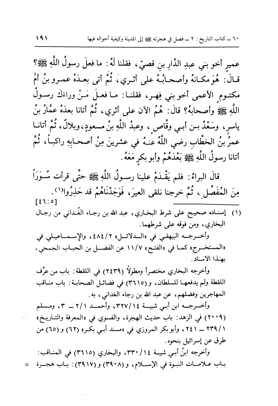 عُمَيْرٍ أَخُو بَنِي عَبْدِ الدَّارِ بْنِ قُصَيٍّ، فَقُلْنَا لَهُ: مَا فَعَلَ رَسُولُ اللَّهِ صَلَّى اللَّهُ عَلَيْهِ وَسَلَّمَ؟ قَالَ: هُوَ مَكَانَهُ وَأَصْحَابُهُ عَلَى أَثَرِي، ثُمَّ أَتَى بَعْدَهُ عَمْرُو بْنُ أُمِّ مَكْتُومٍ الْأَعْمَى أَخُو بَنِي فِهْرٍ، فَقُلْنَا: مَا فَعَلَ مَنْ وَرَاءَكَ رَسُولُ اللَّهِ صَلَّى اللَّهُ عَلَيْهِ وَسَلَّمَ وَأَصْحَابُهُ؟ قَالَ: هُمُ الْآنَ عَلَى أَثَرِي، ثُمَّ أَتَانَا بَعْدَهُ عَمَّارُ بْنُ يَاسِرٍ، وَسَعْدُ بْنُ أَبِي وَقَّاصٍ، وَعَبْدُ اللَّهِ بْنُ مَسْعُودٍ، وَبِلَالٌ، ثُمَّ أَتَانَا عُمَرُ بْنُ الْخَطَّابِ رَضِيَ اللَّهُ عَنْهُ فِي عِشْرِينَ مِنْ أَصْحَابِهِ رَاكِبًا، ثُمَّ أَتَانَا رَسُولُ اللَّهِ صَلَّى اللَّهُ عَلَيْهِ وَسَلَّمَ بَعْدَهُمْ، وَأَبُو بَكْرٍ مَعَهُ، قَالَ الْبَرَاءُ: فَلَمْ يَقْدَمْ عَلَيْنَا رَسُولُ اللَّهِ صَلَّى اللَّهُ عَلَيْهِ وَسَلَّمَ حَتَّى قَرَأْتُ سُوَرًا مِنَ الْمُفَصَّلِ، ثُمَّ خَرَجْنَا نَلْقَى الْعِيرَ، فَوَجَدْنَاهُمْ قَدْ حَذِرُوا (1) . [5: 46]