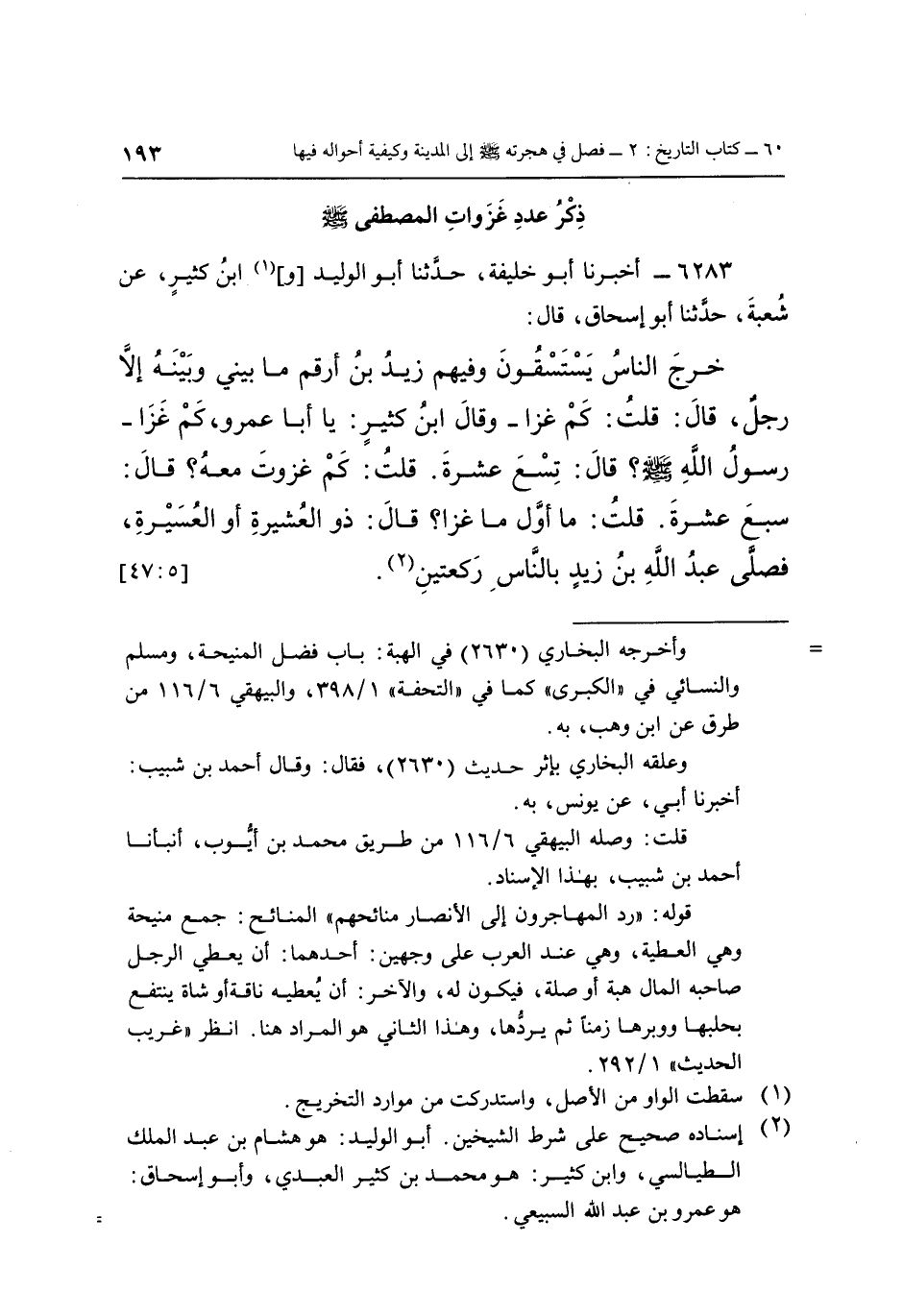 6283 - أَخْبَرَنَا أَبُو خَلِيفَةَ، حَدَّثَنَا أَبُو الْوَلِيدِ، [و] (1) ابْنُ كَثِيرٍ، عَنْ شُعْبَةَ، حَدَّثَنَا أَبُو إِسْحَاقَ، قَالَ: خَرَجَ النَّاسُ يَسْتَسْقُونَ وَفِيهِمْ زَيْدُ بْنُ أَرْقَمَ، مَا بَيْنِي وَبَيْنَهُ إِلَّا رَجُلٌ، قَالَ: قُلْتُ: كَمْ غَزَا؟ وَقَالَ ابْنُ كَثِيرٍ: يَا أَبَا عَمْرٍو كَمْ غَزَا رَسُولُ اللَّهِ صَلَّى اللَّهُ عَلَيْهِ وَسَلَّمَ؟ قَالَ: «تِسْعَ عَشْرَةَ» ، قُلْتُ: كَمْ غَزَوْتَ مَعَهُ؟ قَالَ: سَبْعَ عَشْرَةَ، قُلْتُ: مَا أَوَّلُ مَا غَزَا؟ قَالَ: ذُو الْعُشَيْرَةِ أَوِ الْعُسَيْرَةِ، فَصَلَّى عَبْدُ اللَّهِ بْنُ زَيْدٍ بِالنَّاسِ رَكْعَتَيْنِ (2) . [5: 47]