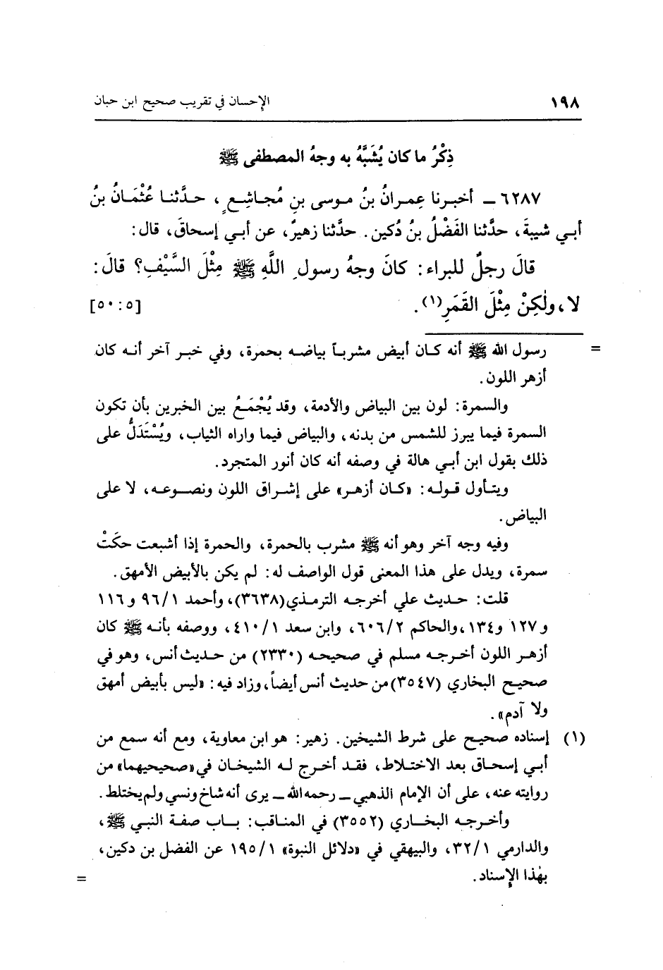 6287 - أَخْبَرَنَا عِمْرَانُ بْنُ مُوسَى بْنِ مُجَاشِعٍ، حَدَّثَنَا عُثْمَانُ بْنُ أَبِي شَيْبَةَ، حَدَّثَنَا الْفَضْلُ بْنُ دُكَيْنٍ، حَدَّثَنَا زُهَيْرٌ، عَنْ أَبِي إِسْحَاقَ، قَالَ: قَالَ رَجُلٌ لِلْبَرَاءِ: كَانَ وَجْهُ رَسُولِ اللَّهِ صَلَّى اللَّهُ عَلَيْهِ وَسَلَّمَ مِثْلَ السَّيْفِ؟ قَالَ: «لَا، وَلَكِنْ مِثْلَ الْقَمَرِ» (1) . [5: 50]