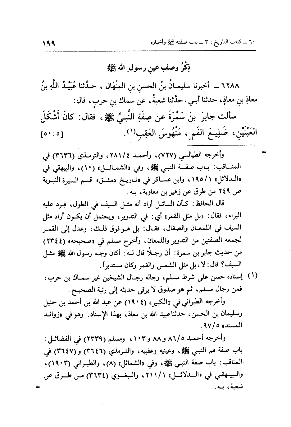 6288 - أَخْبَرَنَا سُلَيْمَانُ بْنُ الْحَسَنِ بْنِ الْمِنْهَالِ، حَدَّثَنَا عُبَيْدُ اللَّهِ بْنُ مُعَاذِ بْنِ مُعَاذٍ، حَدَّثَنَا أَبِي، حَدَّثَنَا شُعْبَةُ، عَنْ سِمَاكِ بْنِ حَرْبٍ، قَالَ: سَأَلْتُ جَابِرَ بْنَ سَمُرَةَ عَنْ صِفَةِ النَّبِيِّ صَلَّى اللَّهُ عَلَيْهِ وَسَلَّمَ، فَقَالَ: «كَانَ أَشْكَلَ الْعَيْنَيْنِ، ضَلِيعَ الْفَمِ، مَنْهُوسَ الْعَقِبِ» (1) . [5: 50]