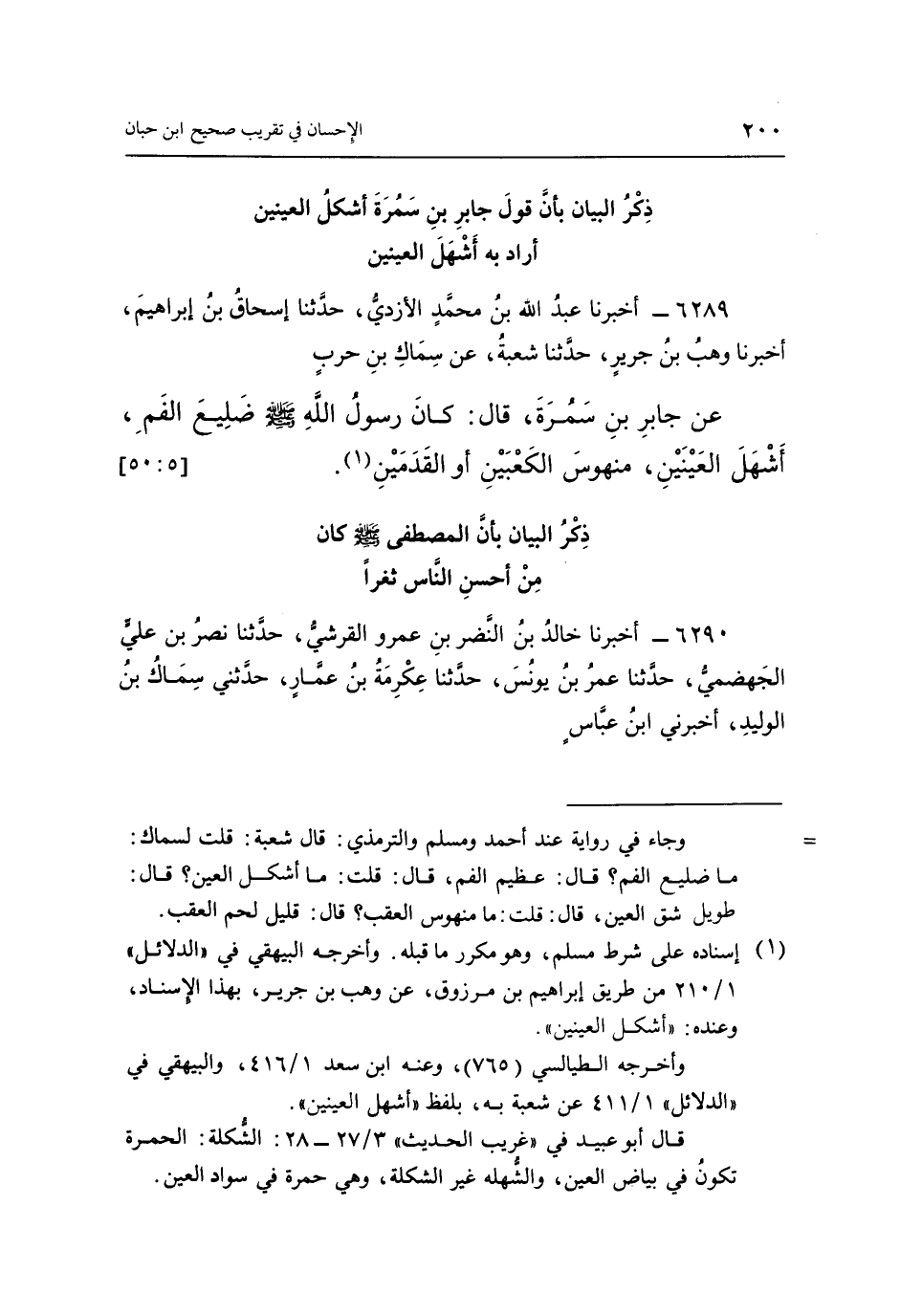 6289 - أَخْبَرَنَا عَبْدُ اللَّهِ بْنُ مُحَمَّدٍ الْأَزْدِيُّ، حَدَّثَنَا إِسْحَاقُ بْنُ إِبْرَاهِيمَ، أَخْبَرَنَا وَهْبُ بْنُ جَرِيرٍ، حَدَّثَنَا شُعْبَةُ، عَنْ سِمَاكِ بْنِ حَرْبٍ، عَنْ جَابِرِ بْنِ سَمُرَةَ، قَالَ: «كَانَ رَسُولُ اللَّهِ صَلَّى اللَّهُ عَلَيْهِ وَسَلَّمَ ضَلِيعَ الْفَمِ، أَشْهَلَ الْعَيْنَيْنِ، مَنْهُوسَ الْكَعْبَيْنِ أَوِ الْقَدَمَيْنِ» (1) . [5: 50]