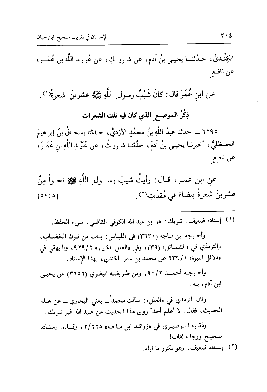 6295 - حَدَّثَنَا عَبْدُ اللَّهِ بْنُ مُحَمَّدٍ الْأَزْدِيُّ، حَدَّثَنَا إِسْحَاقُ بْنُ إِبْرَاهِيمَ الْحَنْظَلِيُّ، أَخْبَرَنَا يَحْيَى بْنُ آدَمَ، حَدَّثَنَا شَرِيكٌ، عَنْ عُبَيْدِ اللَّهِ بْنِ عُمَرَ، عَنْ نَافِعٍ، عَنِ ابْنِ عُمَرَ، قَالَ: «رَأَيْتُ شِيبَ رَسُولِ اللَّهِ صَلَّى اللَّهُ عَلَيْهِ وَسَلَّمَ نَحْوًا مِنْ عِشْرِينَ شَعْرَةً بَيْضَاءَ فِي مُقَدِّمَتِهِ» (2) . [5: 50]