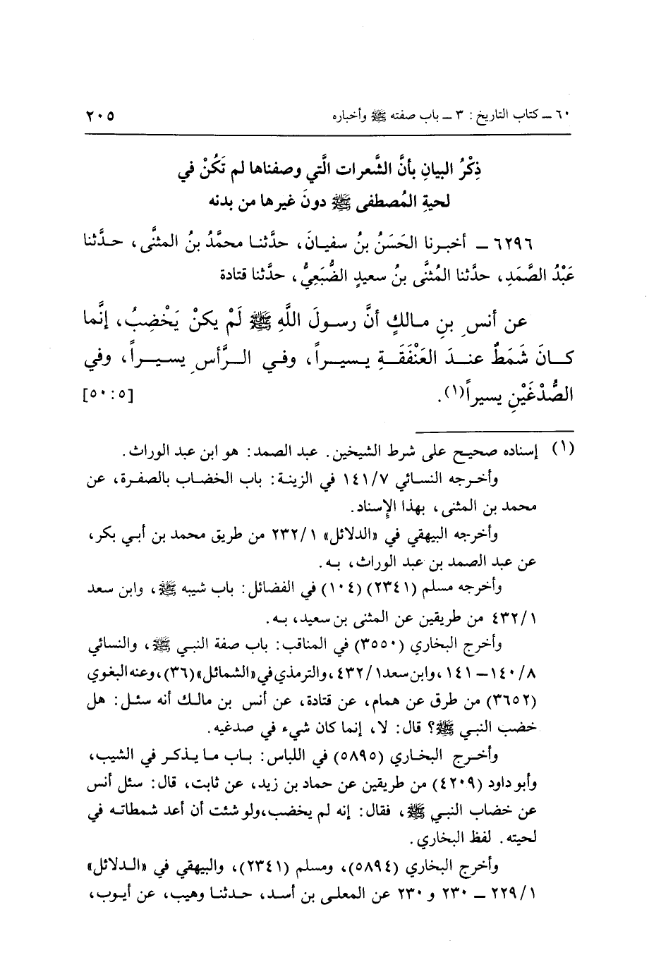 6296 - أَخْبَرَنَا الْحَسَنُ بْنُ سُفْيَانَ، حَدَّثَنَا مُحَمَّدُ بْنُ الْمُثَنَّى، حَدَّثَنَا عَبْدُ الصَّمَدِ، حَدَّثَنَا الْمُثَنَّى بْنُ سَعِيدٍ الضُّبَعِيُّ، حَدَّثَنَا قَتَادَةُ، عَنْ أَنَسِ بْنِ مَالِكٍ، «أَنَّ رَسُولَ اللَّهِ صَلَّى اللَّهُ عَلَيْهِ وَسَلَّمَ لَمْ يَكُنْ يَخْضِبُ، إِنَّمَا كَانَ شَمَطٌ عِنْدَ الْعَنْفَقَةِ يَسِيرًا، وَفِي الرَّأْسِ يَسِيرًا، وَفِي الصُّدْغَيْنِ يَسِيرًا» (1) . [5: 50]
