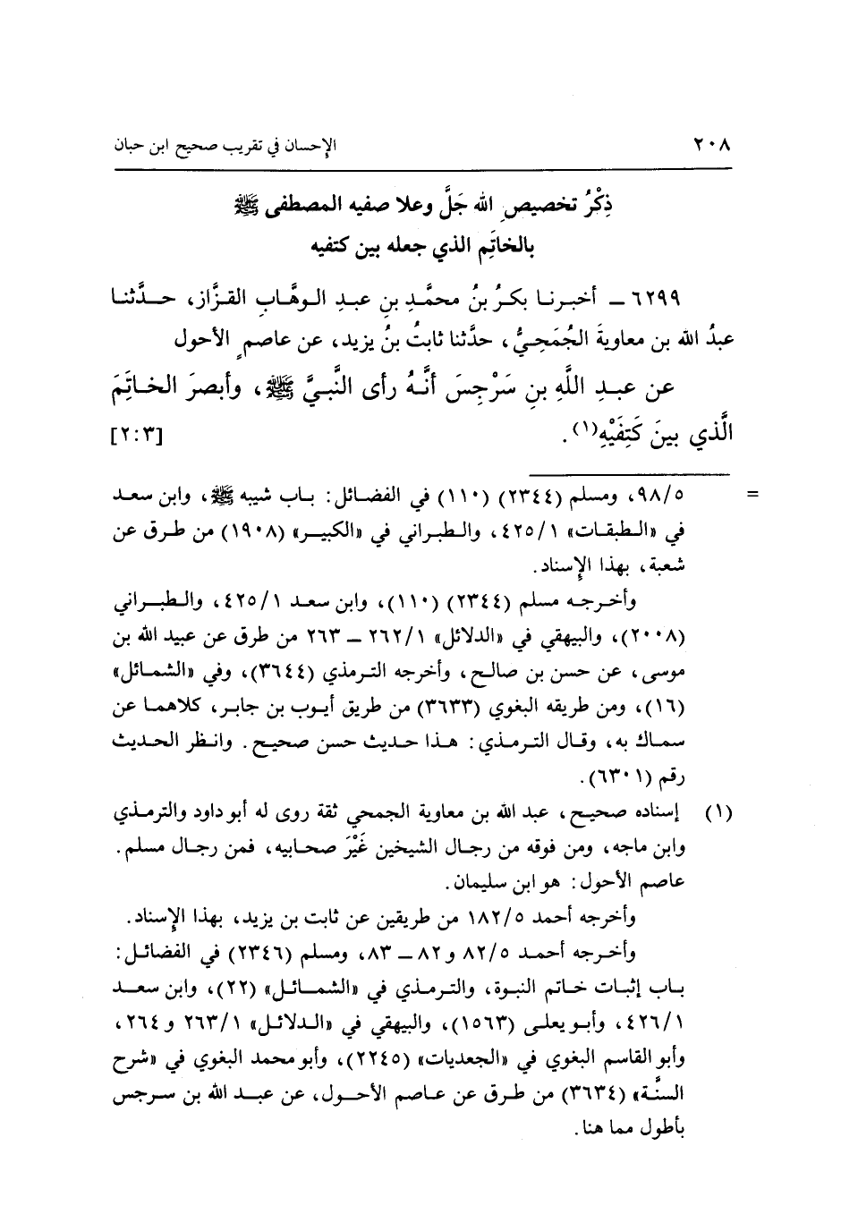 6299 - أَخْبَرَنَا بَكْرُ بْنُ مُحَمَّدِ بْنِ عَبْدِ الْوَهَّابِ الْقَزَّازُ، حَدَّثَنَا عَبْدُ اللَّهِ بْنُ مُعَاوِيَةَ الْجُمَحِيُّ، حَدَّثَنَا ثَابِتُ بْنُ يَزِيدَ، عَنْ عَاصِمٍ الْأَحْوَلِ، عَنْ عَبْدِ اللَّهِ بْنِ سَرْجِسَ: «أَنَّهُ رَأَى النَّبِيَّ صَلَّى اللَّهُ عَلَيْهِ وَسَلَّمَ وَأَبْصَرَ الْخَاتَمَ الَّذِي بَيْنَ كَتِفَيْهِ» (1) . [3: 2]