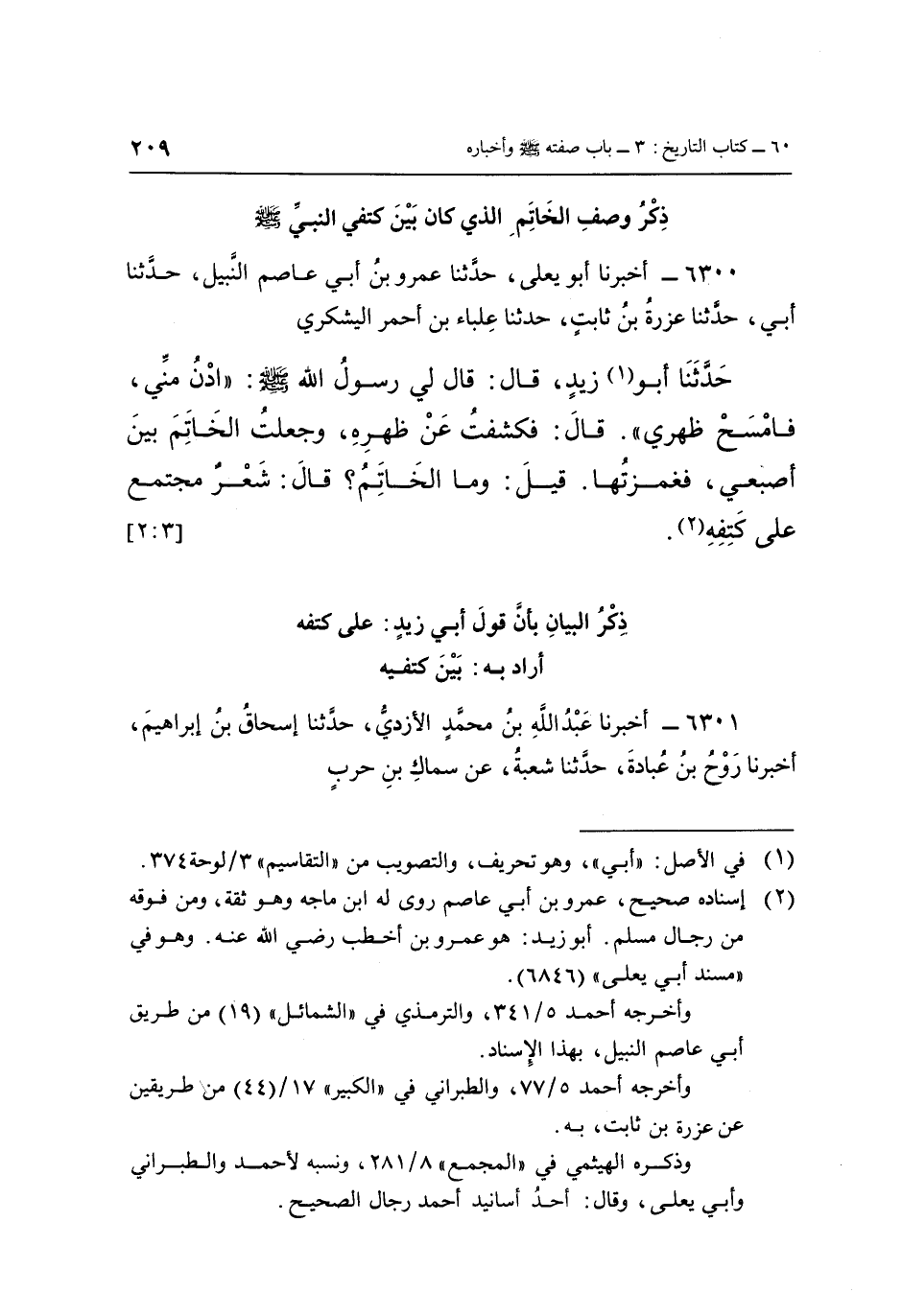 قَالَ: فَكَشَفْتُ عَنْ ظَهْرِهِ، وَجَعَلْتُ الْخَاتَمَ بَيْنَ أُصْبُعِي فَغَمَزْتُهَا، قِيلَ: وَمَا الْخَاتَمُ؟ قَالَ: شَعْرٌ مُجْتَمِعٌ عَلَى كَتِفِهِ (2) . [3: 2]