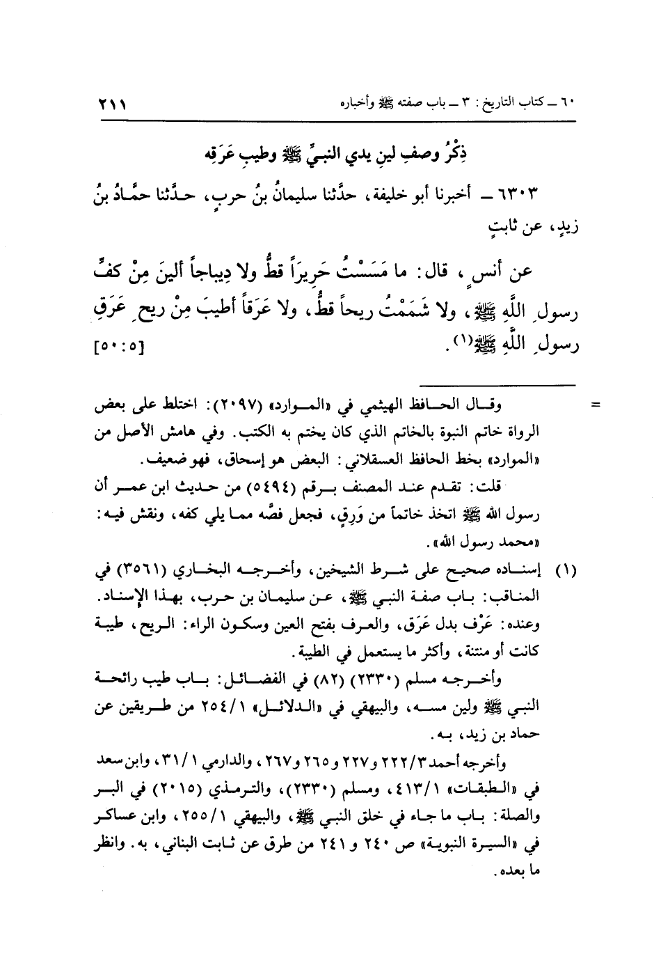 6303 - أَخْبَرَنَا أَبُو خَلِيفَةَ، حَدَّثَنَا سُلَيْمَانُ بْنُ حَرْبٍ، حَدَّثَنَا حَمَّادُ بْنُ زَيْدٍ، عَنْ ثَابِتٍ، عَنْ أَنَسٍ، قَالَ: «مَا مَسَسْتُ حَرِيرًا قَطُّ، وَلَا دِيبَاجًا أَلْيَنَ مِنْ كَفِّ رَسُولِ اللَّهِ صَلَّى اللَّهُ عَلَيْهِ وَسَلَّمَ، وَلَا شَمَمْتُ رِيحًا قَطُّ، وَلَا عَرَقًا أَطْيَبَ مِنْ رِيحِ عَرَقِ رَسُولِ اللَّهِ صَلَّى اللَّهُ عَلَيْهِ وَسَلَّمَ» (1) . [5: 50]