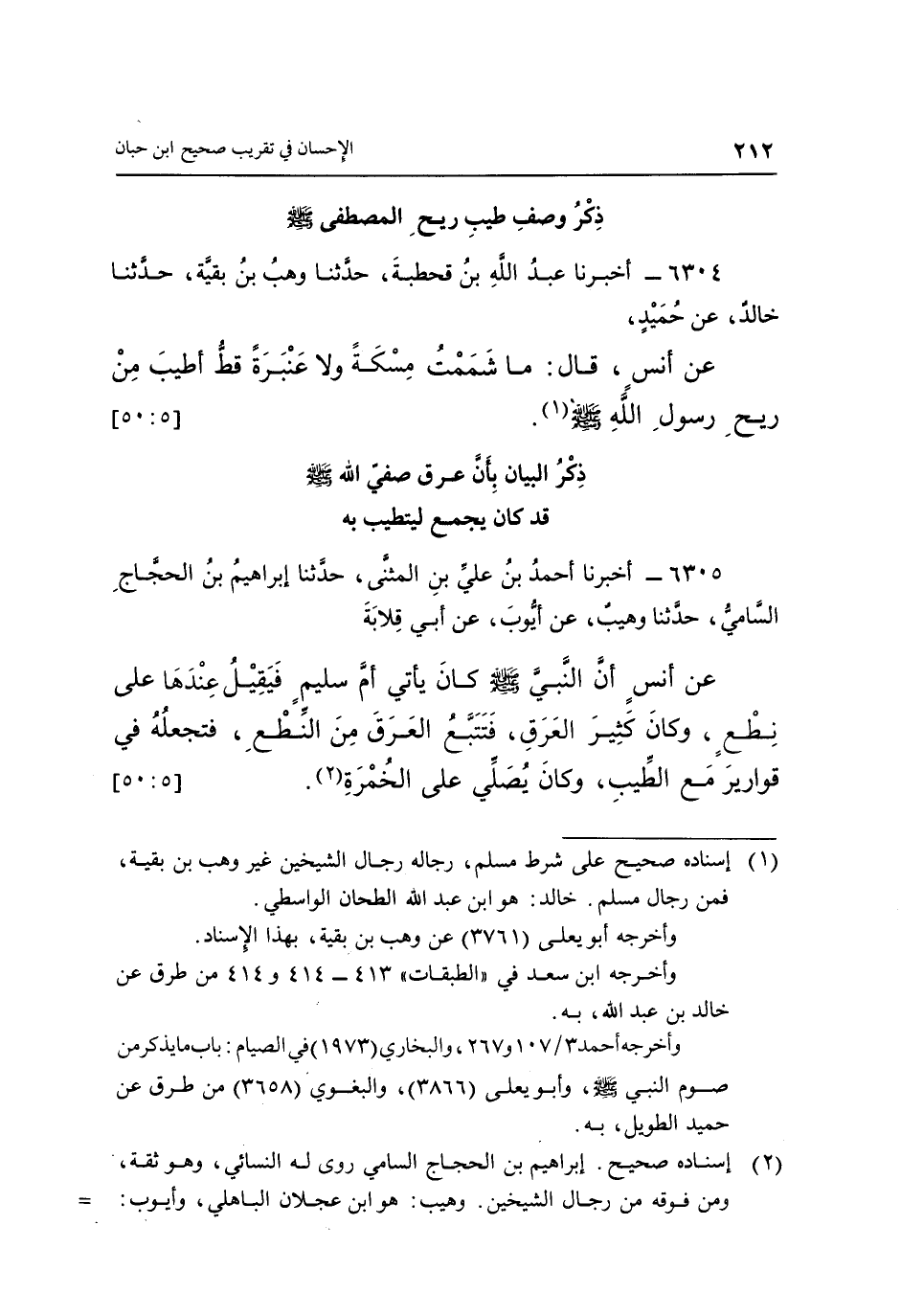 6304 - أَخْبَرَنَا عَبْدُ اللَّهِ بْنُ قَحْطَبَةَ، حَدَّثَنَا وَهْبُ بْنُ بَقِيَّةَ، حَدَّثَنَا خَالِدٌ، عَنْ حُمَيْدٍ، عَنْ أَنَسٍ، قَالَ: «مَا شَمَمْتُ مِسْكَةً، وَلَا عَنْبَرَةً قَطُّ أَطْيَبَ مِنْ رِيحِ رَسُولِ اللَّهِ صَلَّى اللَّهُ عَلَيْهِ وَسَلَّمَ» (1) . [5: 50]